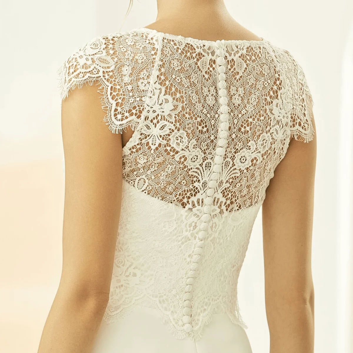 Wunderschöner Bolero E323 von Avalia (Bianco Evento) aus hochwertiger Spitze in Farbe Ivory. Der Bolero E323 hat zarte kurze Ärmel und hat spitzenbesetzte Knöpfe am Rücken, welche das An- und Ausziehen erleichtern. Dadurch lässt sich der Bolero ganz bequem tragen und sieht einfach bezaubernd aus. Ein exklusives Hochzeits-Accessoire und eine gute Ergänzung zum Brautkleid in der passenden Farbe Ivory oder Weiß. Hohe Qualität, sorgfältig entworfen und produziert in der Europäischen Union.