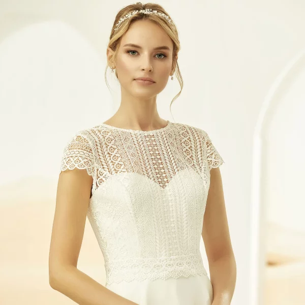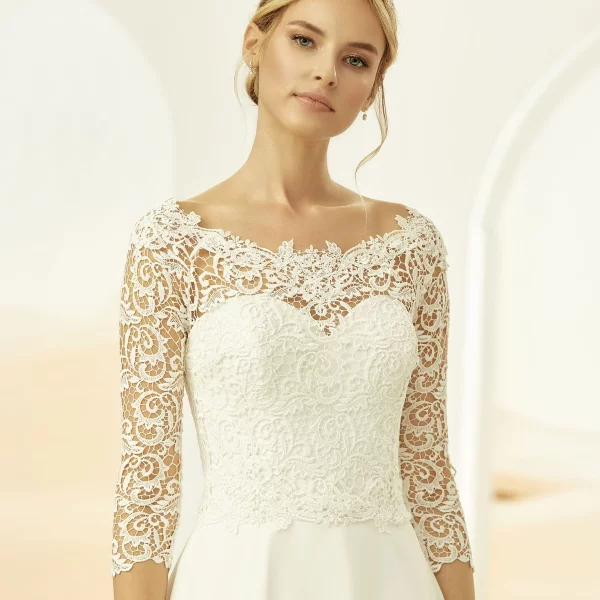 Wunderschöner Bolero E330 von Avalia (Bianco Evento) aus hochwertiger Spitze in Farbe Ivory. Der Bolero E330 hat zarte 3/4 Ärmel und hat spitzenbesetzte Knöpfe am Rücken, welche das An- und Ausziehen erleichtern. Dadurch lässt sich der Bolero ganz bequem tragen und sieht einfach bezaubernd aus. Ein exklusives Hochzeits-Accessoire und eine gute Ergänzung zum Brautkleid in der passenden Farbe Ivory oder Weiß. Hohe Qualität, sorgfältig entworfen und produziert in der Europäischen Union.