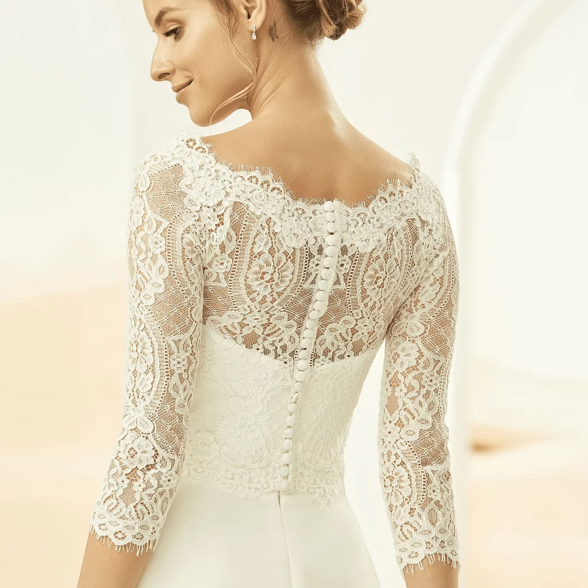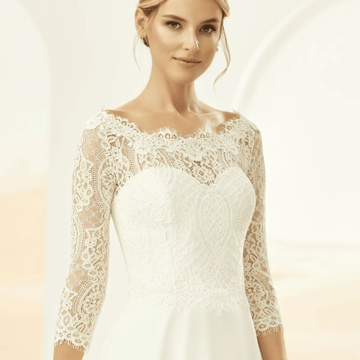 Eleganter Bolero E331 von Avalia (Bianco Evento) aus hochwertiger Spitze mit floralen Elementen in Farbe Ivory. Der Bolero E331 hat zarte 3/4 Ärmel und hat spitzenbesetzte Knöpfe am Rücken, welche das An- und Ausziehen erleichtern. Dadurch lässt sich der Bolero ganz bequem tragen und sieht einfach bezaubernd aus. Ein exklusives Hochzeits-Accessoire und eine gute Ergänzung zum Brautkleid in der passenden Farbe Ivory oder Weiß. Hohe Qualität, sorgfältig entworfen und produziert in der Europäischen Union.