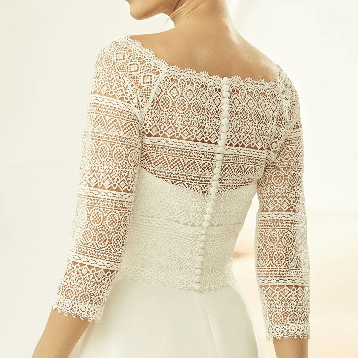 Eleganter Bolero E332 von Avalia (Bianco Evento) aus hochwertiger Spitze in Farbe Ivory. Der Bolero E332 hat zarte 3/4 Ärmel und hat spitzenbesetzte Knöpfe am Rücken, welche das An- und Ausziehen erleichtern. Dadurch lässt sich der Bolero ganz bequem tragen und sieht einfach bezaubernd aus. Ein exklusives Hochzeits-Accessoire und eine gute Ergänzung zum Brautkleid in der passenden Farbe Ivory oder Weiß. Hohe Qualität, sorgfältig entworfen und produziert in der Europäischen Union.