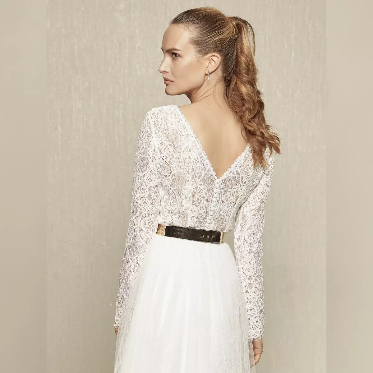 Wunderschöner Bolero E349 von Avalia (Bianco Evento) aus hochwertiger Spitze in Farbe Ivory. Der Bolero E349 hat einen Rundhalsausschnitt vorne und V-Ausschnitt am Rücken. Er verfügt über lange Ärmel und ein ausgefallenes und zeitloses Design. Dieser Braut-Bolero kann mit einem Kleid oder Rock getragen werden und passt wunderbar zu nahezu jedem Brautlook. Hohe Qualität, detailverliebt entworfen und produziert in der Europäischen Union.