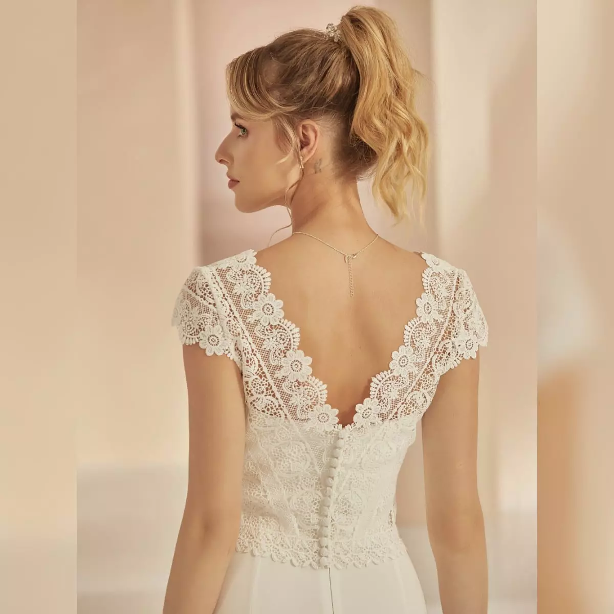 Zarter Braut-Bolero E364 aus hochwertiger Spitze in der Farbe Ivory. Mit V-Ausschnitt vorne und am Rücken.