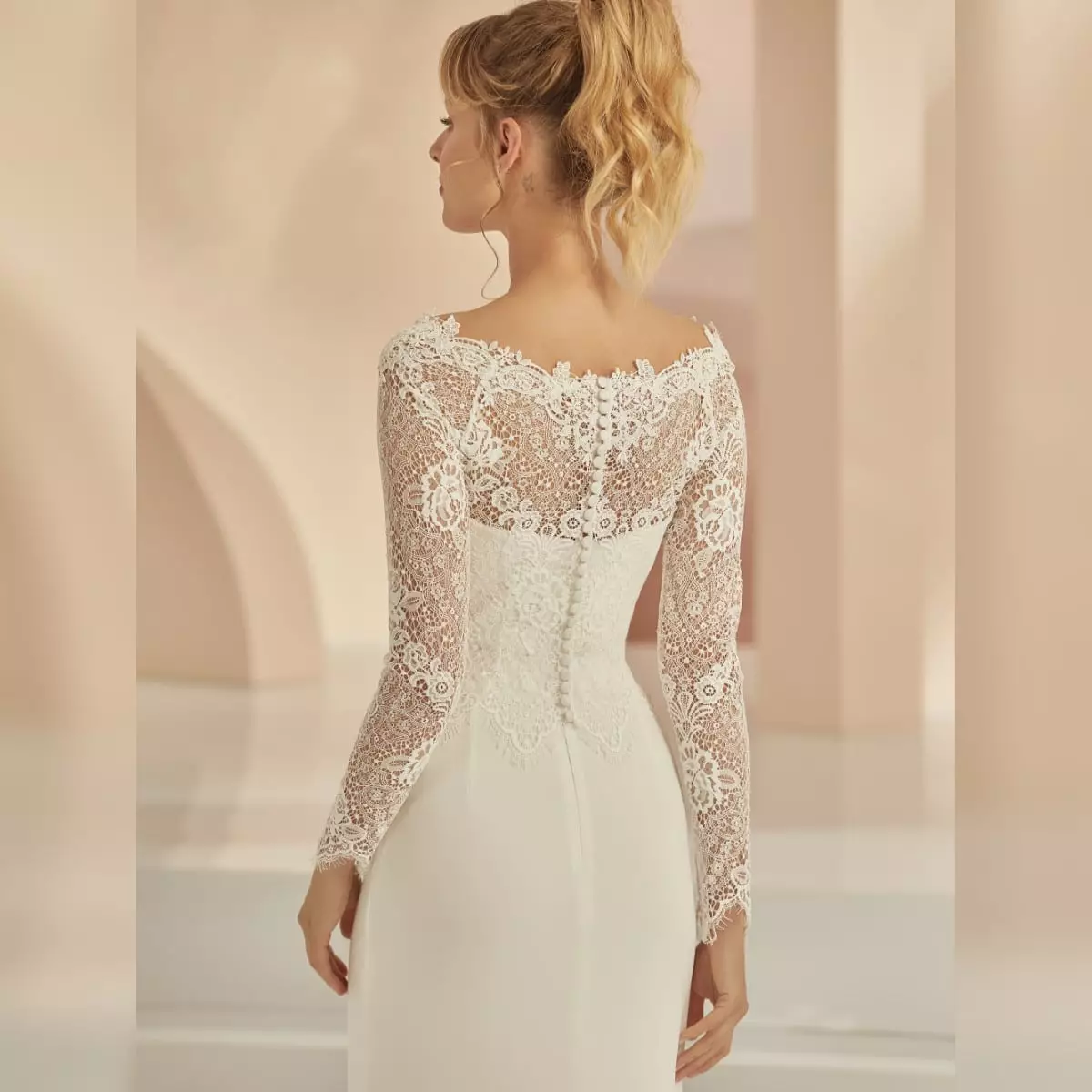 Schöner Braut-Bolero E374 aus zarter Spitze in Farbe Ivory. Mit langen Ärmeln und U-Boot-Ausschnitt.