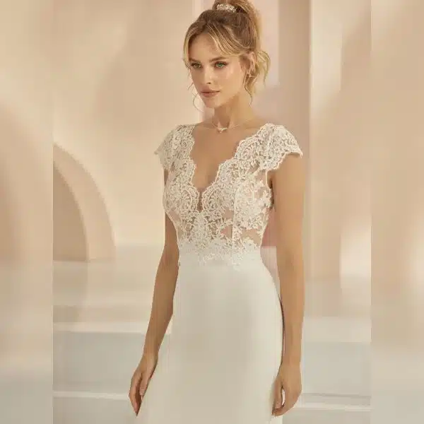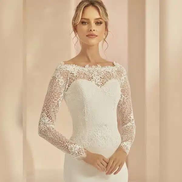 Eleganter Braut-Bolero E375 aus zarter Spitze in Farbe Ivory. Mit kurzen Ärmeln und V-Ausschnitt.