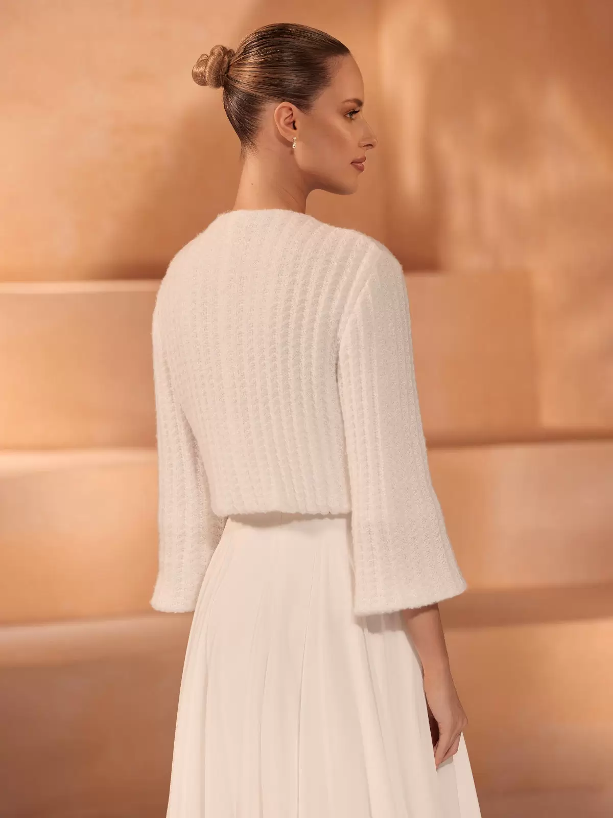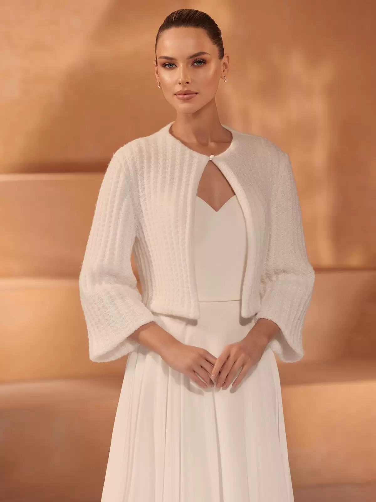 Der Avalia Braut-Strickpullover E432 (Bianco Evento) ist ein bezaubernder Bolero aus Strick mit eleganten langen Ärmeln. Der Frontverschluss und der klassische Rundhalsausschnitt verleihen jeder Braut eine zeitlose Eleganz. Sorgfältig in der EU entworfen, ist er die perfekte Ergänzung für Ihr Brautensemble.