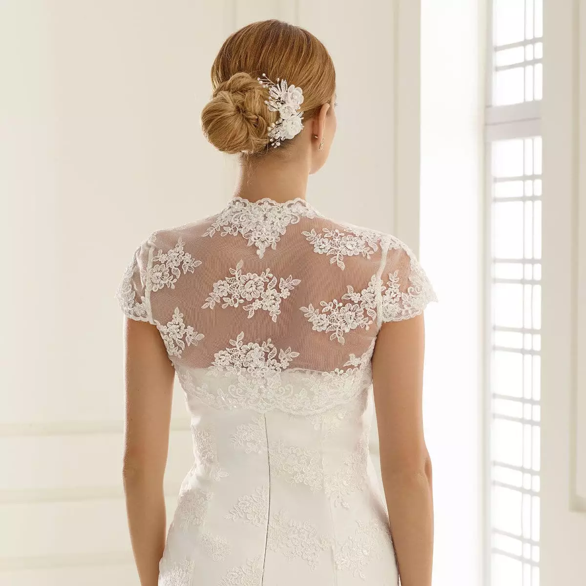 Stylischer Bolero E105 aus hochwertiger Spitze mit kurzen Ärmeln. Dieser wunderschöne Bolero ist in der Farbe Ivory lieferbar und besteht aus hochwertiger Spitze, handverziert mit Glasperlen mit Unterfutter aus weichem Tüll. Dieser Bolero E105 ist eine ideale Ergänzung zum Brautkleid in Farbe Ivory oder Weiß und ein exklusiver Accessoire für die Hochzeit. Hohe Qualität, sorgfältig entworfen und produziert in der Europäischen Union.