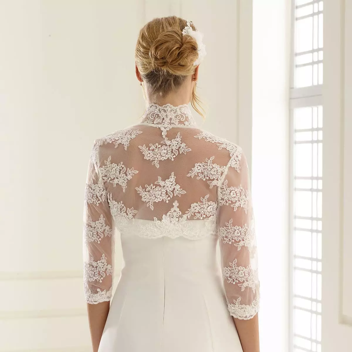 Stylischer Bolero E106 aus hochwertiger Spitze mit 3/4 Ärmeln. Dieser wunderschöne Bolero ist in der Farbe Ivory lieferbar und besteht aus hochwertiger Spitze, handverziert mit Glasperlen mit Unterfutter aus weichem Tüll. Dieser Bolero E106 ist eine ideale Ergänzung zum Brautkleid in Farbe Ivory oder Weiß und ein exklusiver Accessoire für die Hochzeit. Hohe Qualität, sorgfältig entworfen und produziert in der Europäischen Union.