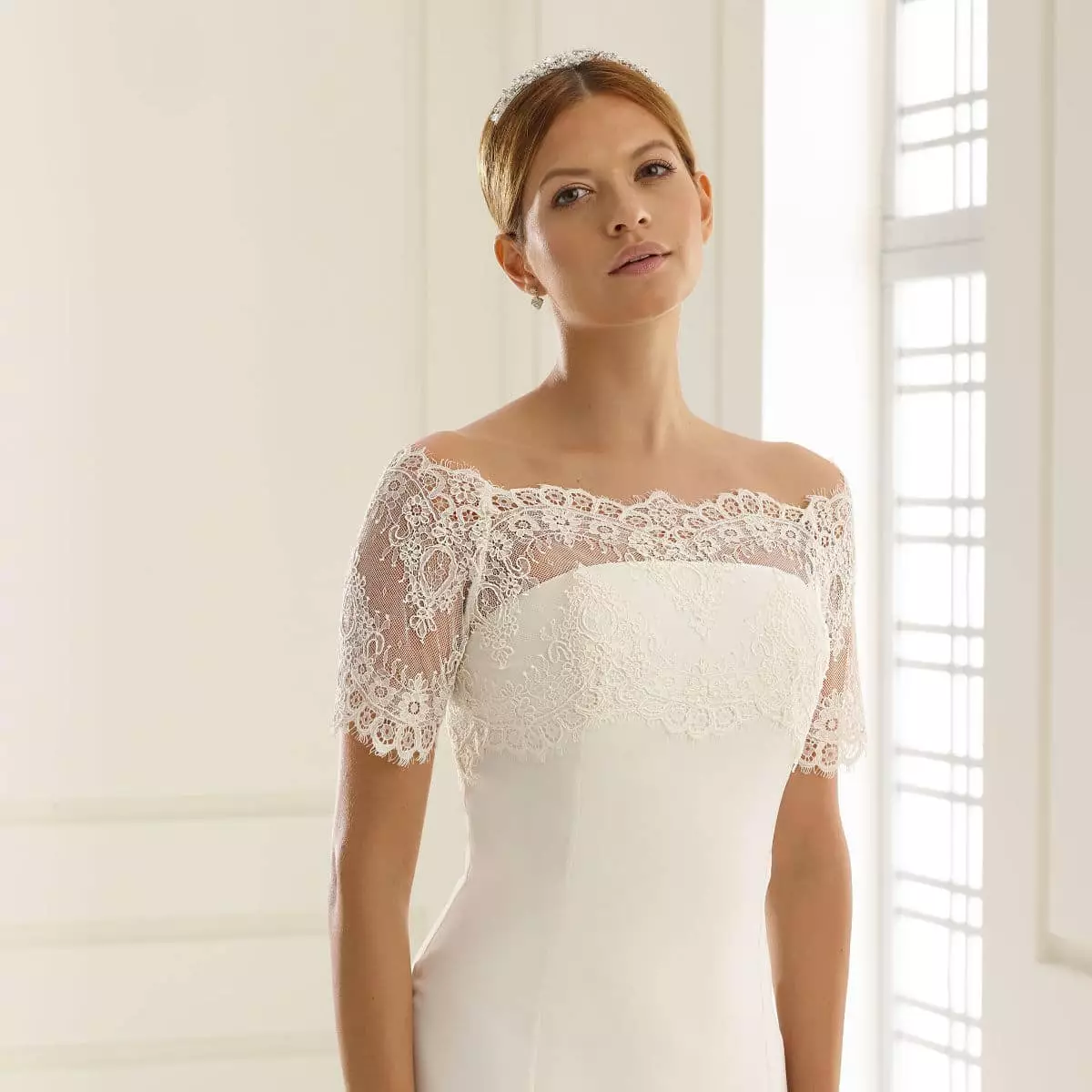 Dieser Bolero E148 ist eine ideale Ergänzung zum Brautkleid in Farbe Ivory oder Weiß und ein exklusiver Accessoire für die Hochzeit. Hohe Qualität, sorgfältig entworfen und produziert in der Europäischen Union.