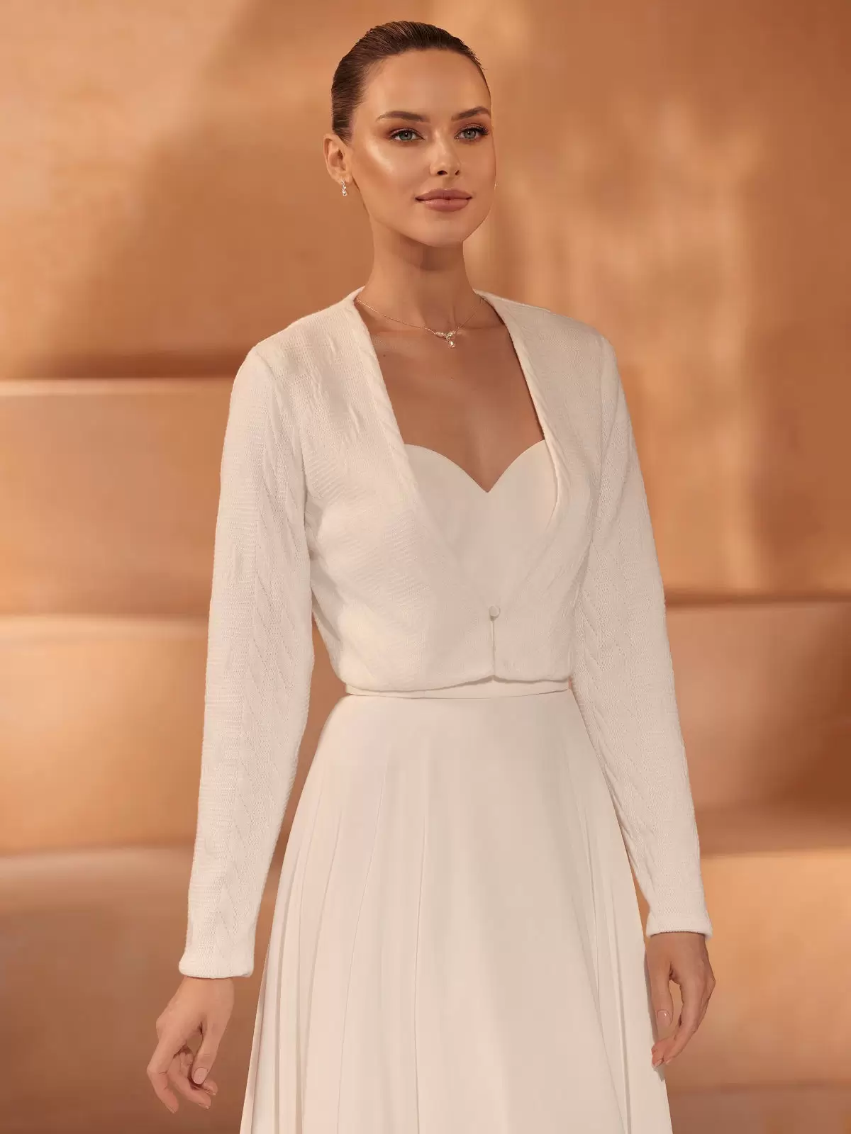 Der Braut-Bolero Avalia E437 von Avalia (Bianco Evento) vereint Komfort und Eleganz. Hergestellt aus feinem Strickstoff, präsentiert er sich mit vollen Ärmeln und einem ansprechenden V-Ausschnitt. Sorgfältig in der EU entworfen, verleiht dieser Bolero Brautkleidern eine stilvolle Note.