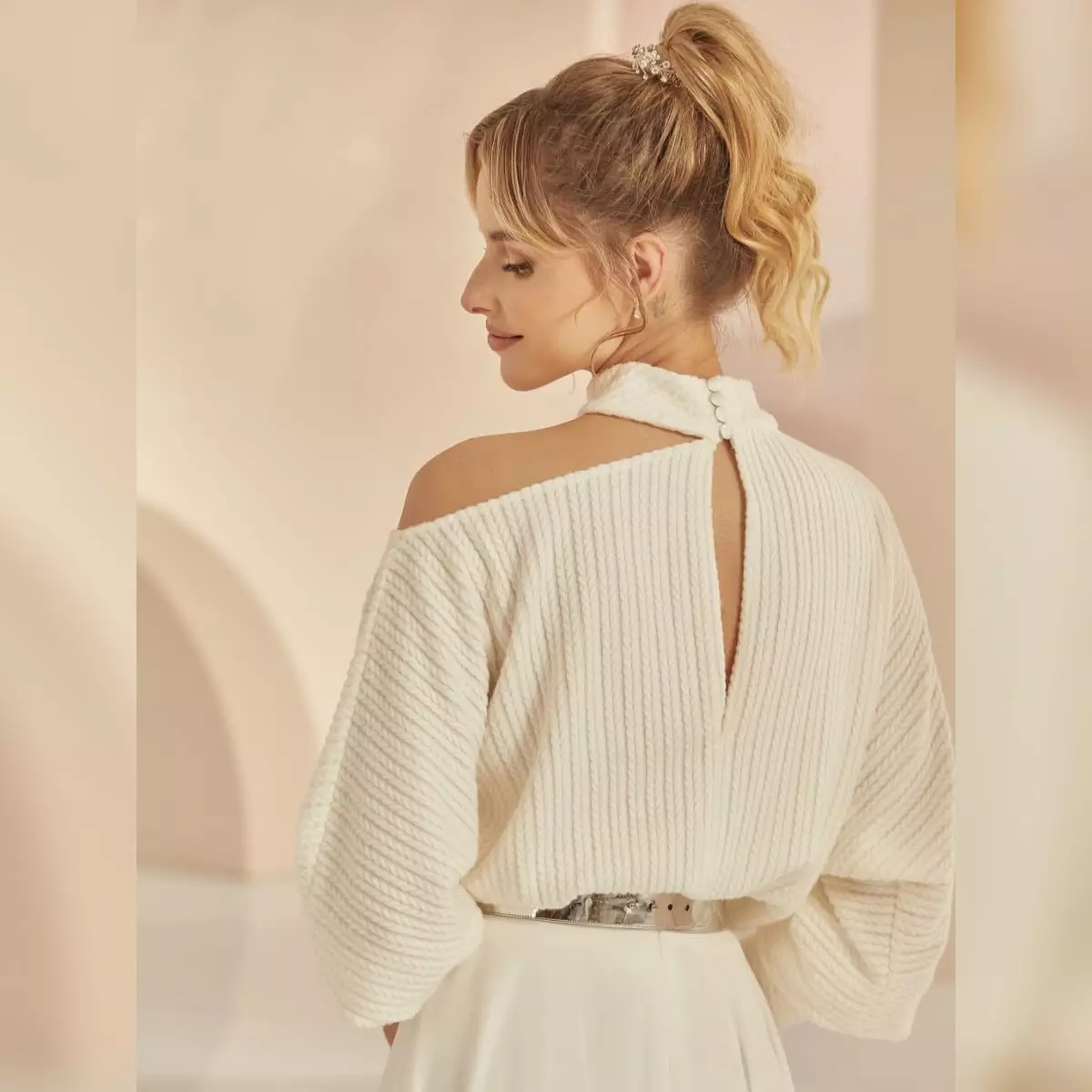 Charmanter Strickpullover E362 für die Hochzeit von Avalia (Bianco Evento) aus der neuen Kollektion. Der Braut-Bolero E362 besteht aus Wolle in der Farbe Ivory und hat lange Ärmel. Der elegante One-Shoulder-Look ist gerade voll im Trend und ergänzt ideal dein Brautkleid. Ein wunderschöner Pulli für die Hochzeit, der kuschelige Wärme an kühlen Tagen spendet. Erstklassige Qualität – entworfen und produziert in der Europäischen Union.