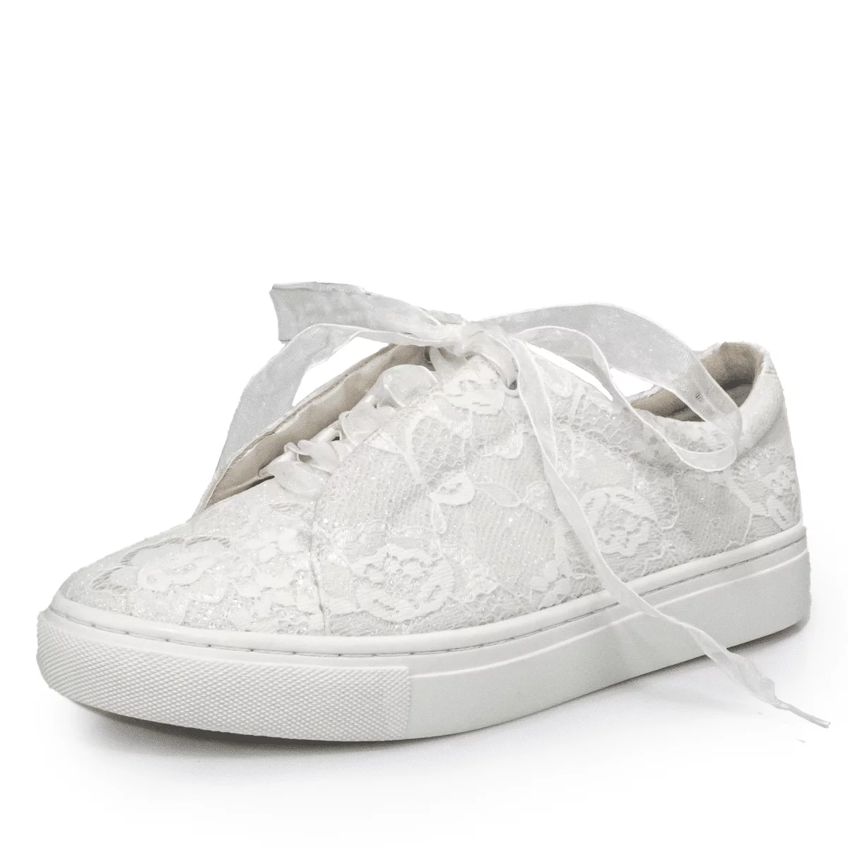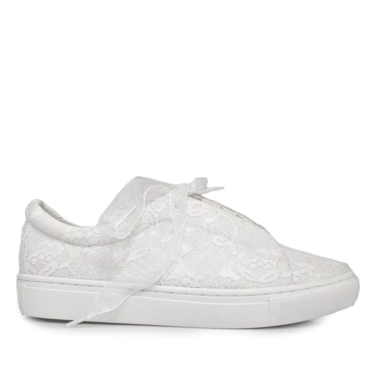 Die schönen Braut-Sneaker 936 Ivory Spitze aus der White Lady Kollektion sind besonders bequem und elegant zugleich. Diese Sneaker sind aus Spitze in Farbe Ivory gefertigt und mit Spitze verziert. Dieses Modell ist besonders bequem, da die Decksohle innen gepolstert ist. Die Schuhe 936 Ivory Spitze passen für normal weite Füße. Diese stylische Sneaker mit hübschen Schnürsenkel aus feiner Organza in Ivory!