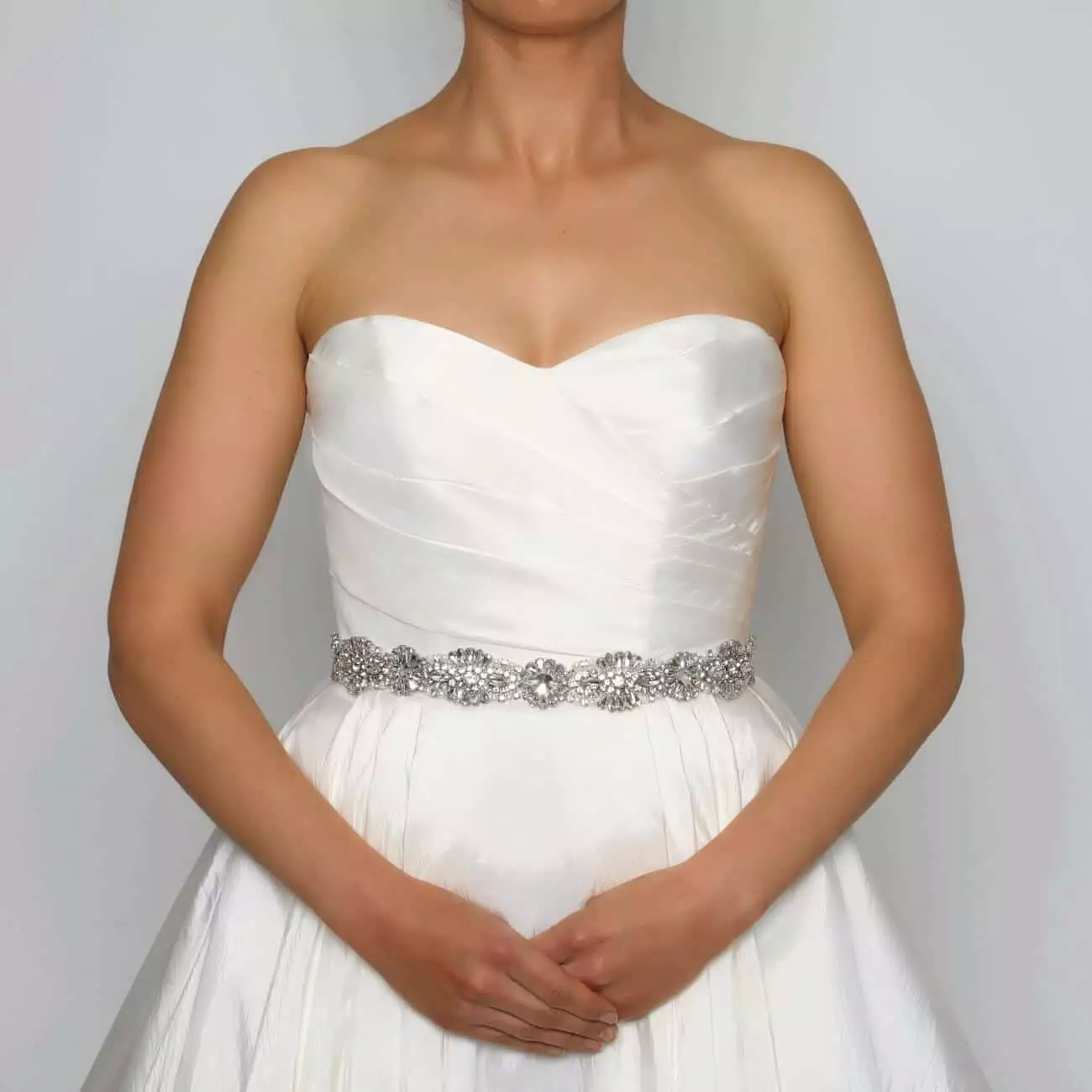Brautgürtel PBB1012 von The Perfect Bridal Company in einem trendigen Vintage-Look. Dieser elegante Taillengürtel besteht aus einem elfenbeinfarbenem Satinband, welcher mit vielen schimmernden Kristallsteinen, Rocailles und Perlen verziert ist. Die Länge des Taillengürtels beträgt ca. 2,75 m. Es hat ein außergewöhnliches Design mit einem sich wiederholenden Blumenmuster.