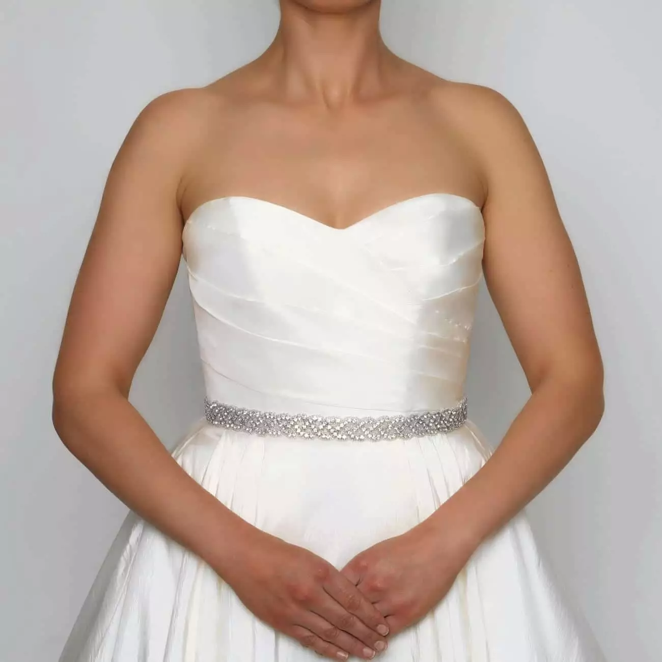 Der atemberaubende Brautgürtel PBB1019 von The Perfect Bridal Company kommt in einem gewebten Zopfdesign aus funkelnden Kristall-Strasssteinen und silbernen Rocailles. Dieser silberfarbene Taillengürtel hebt elegant Deine Taille hervor und ist ein absolutes Highlight in Deinem Brautlook! Die Gesamtlänge des Gürtels beträgt ca. 2,75 m.