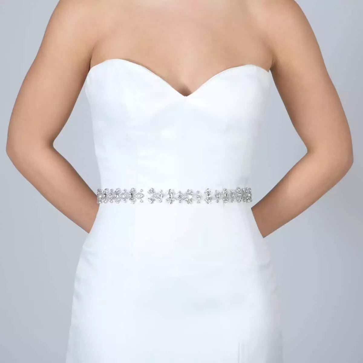 Der wunderschöne Schärpengürtel PBB1027 von The Perfect Bridal Company kommt in einem schlanken und modernen Design. Er besteht aus kristallklaren Strasssteinen in verschiedenen Größen und Formen, eingerahmt von hübschen, dünnen, silbernen Hornperlen an einer elfenbeinfarbenen Schärpe aus Satin. Verleiht jedem Braut-Ensemble einen Hauch von Glanz!
