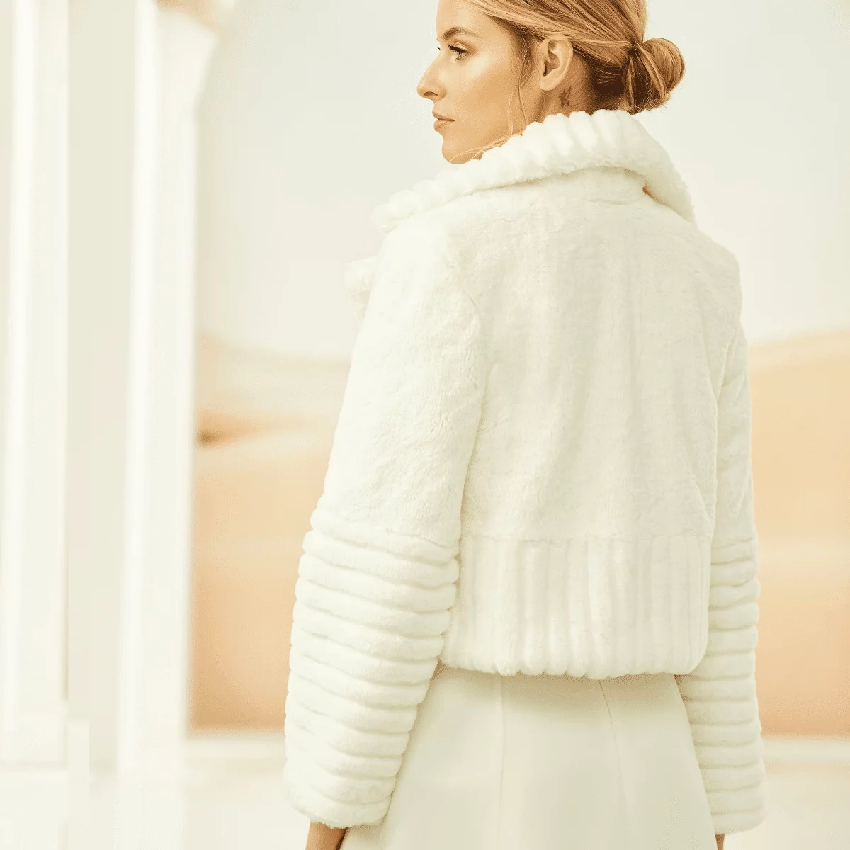 Stylische Brautjacke / Bolero aus Pelzimitat mit langen Ärmeln ist in verschiedenen Größen verfügbar. Die Brautjacke / Cape in Pelzimitat ist vorne offen. Diese Brautjacke E314 von Avalia ist eine ideale Ergänzung zum Brautkleid in Farbe Ivory oder Weiß und ein exklusiver Accessoire für die Hochzeit. Geeignet für eine Hochzeitsfeier draußen an kalten Tagen im Herbst und Winter oder an kühlen Frühlingstagen, damit die Braut sich wohl fühlt. Hohe Qualität, sorgfältig entworfen und produziert in der Europäischen Union.