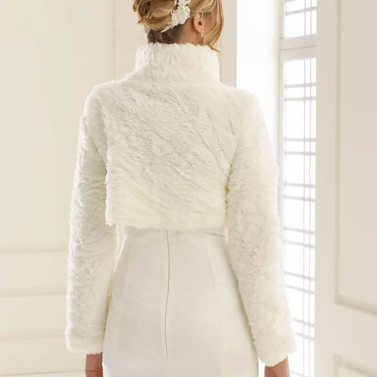 Stylische Brautjacke in Pelzoptik (hochwertiges Kunstfell, Kurzhaar-Fellimitat) mit Ärmeln, in verschiedenen Größen verfügbar. Unterfutter der Brautjacke E155 ist aus Satin angefertigt. Die Brautjacke / Cape in Pelzoptik ist mit Stehkragen mit drei Knöpfen vorne zum Verschließen verfügbar. Diese Brautjacke E155 von Avalia ist eine ideale Ergänzung zum Brautkleid in Farbe Ivory oder Weiß und ein exklusiver Accessoire für die Hochzeit. Geeignet für eine Hochzeitsfeier draußen an kalten Tagen im Herbst und Winter oder an kühlen Frühlingstagen, damit die Braut sich wohl fühlt. Hohe Qualität, sorgfältig entworfen und produziert in der Europäischen Union.