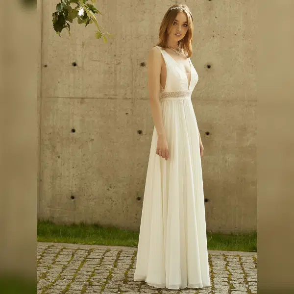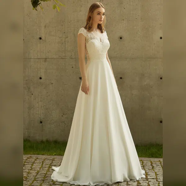 Es handelt sich um ein figurbetontes und eng anliegendes Modell in A-Linie Design. Das Kleid ist ärmellos mit einem Rundhalsausschnitt vorne und einem stylischen Rückenausschnitt. Hinten lässt sich das Brautkleid einfach mit Knöpfen schließen, was das An- und Ausziehen enorm erleichtert. Für das optische Highlight sorgt ein Perlenband am Ausschnitt und an der Taille. Das Modell BN-001 ist zudem mit einer 35 cm langen Schleppe ausgestattet, welche besonders elegant das Kleid abschließt.