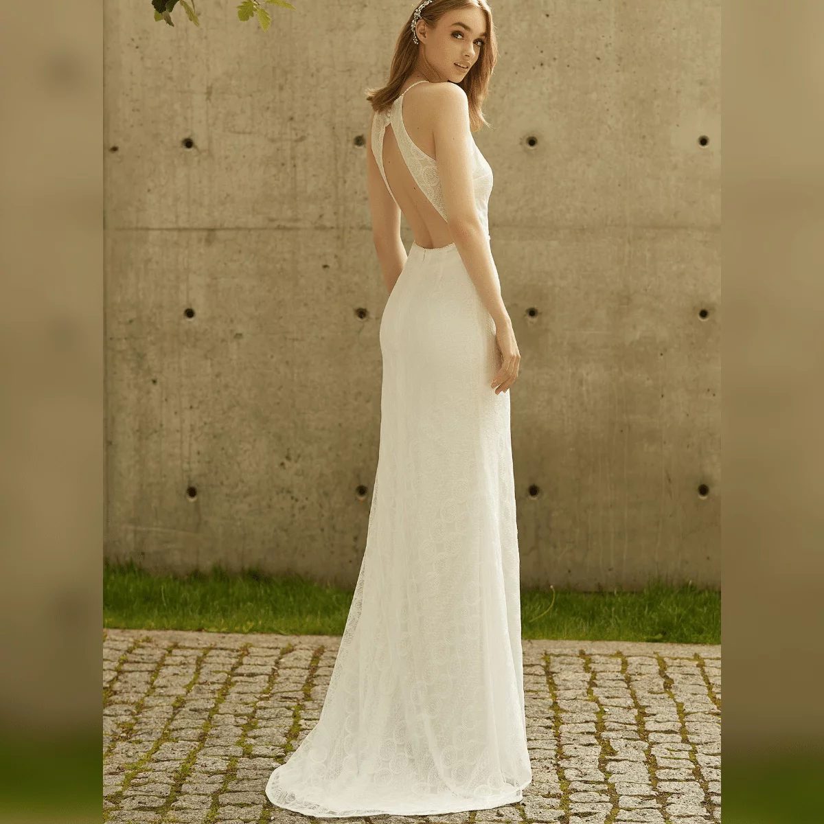 Es handelt sich um ein figurbetontes und eng anliegendes Modell in A-Linie Design. Das Kleid ist ärmellos mit einem Rundhalsausschnitt vorne und einem stylischen Rückenausschnitt. Hinten lässt sich das Brautkleid einfach mit Knöpfen schließen, was das An- und Ausziehen enorm erleichtert. Für das optische Highlight sorgt ein Perlenband am Ausschnitt und an der Taille. Das Modell BN-001 ist zudem mit einer 35 cm langen Schleppe ausgestattet, welche besonders elegant das Kleid abschließt.