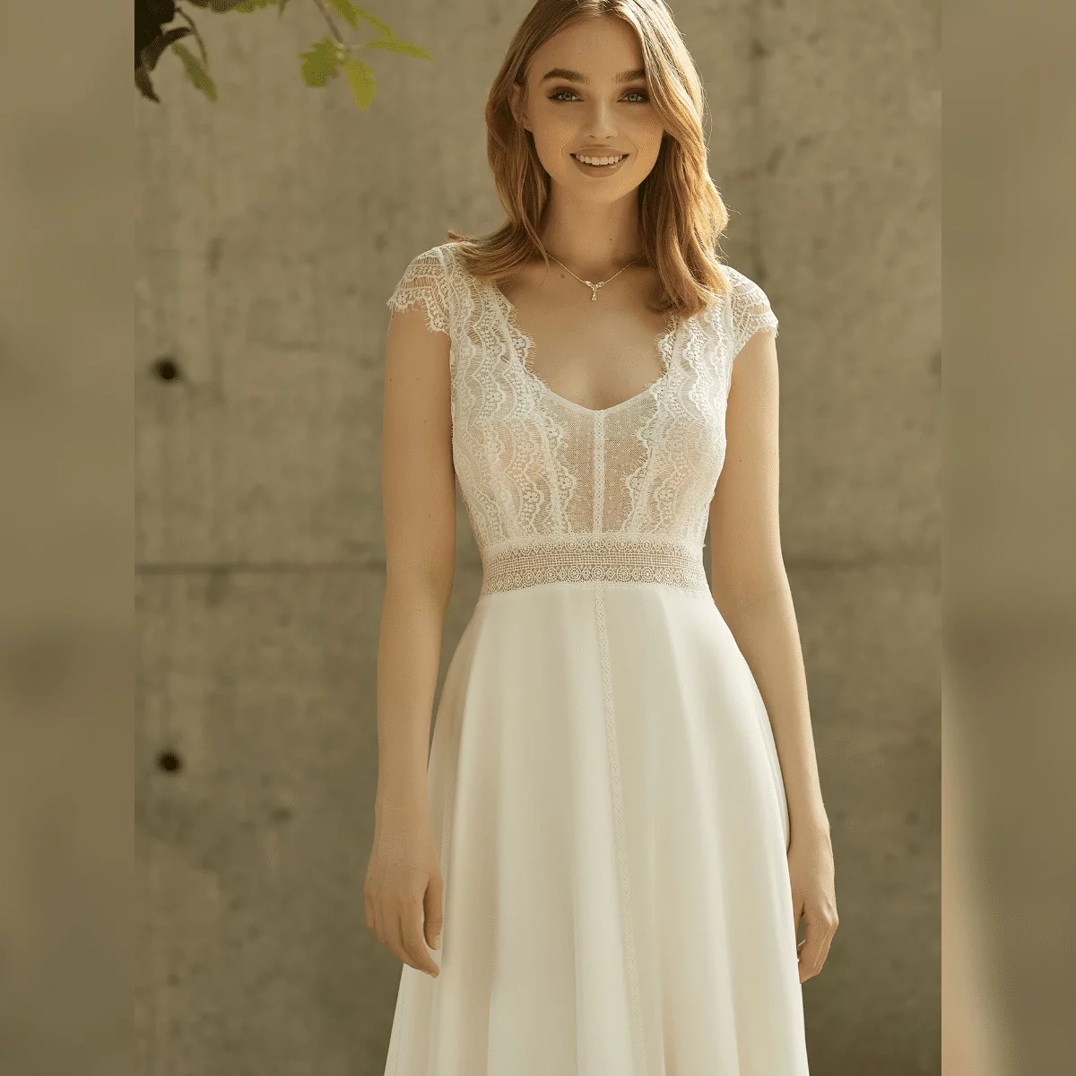 Stylisches Brautkleid BN-002 von Bride Now im Boho-Stil in der klassischen Farbe Ivory (Elfenbeinfarbe). Hergestellt aus zarter Spitze mit floralem Motiv, Brustbereich mit gepunktetem Tüll und Oberteil mit Tüll unterlegt. Dieses Kleid bietet einen erstklassigen Komfort und lässt sich einfach An- und Ausziehen. Das Brautkleid BN-002 kommt in einem eleganten A-Linie Design im Boho-Stil mit tailliertem und transparentem Oberteil und langem Chiffon-Rock. Eine ideale Wahl für die Braut, die nach einem klassischen und zugleich besonders stylischen Kleid sucht.