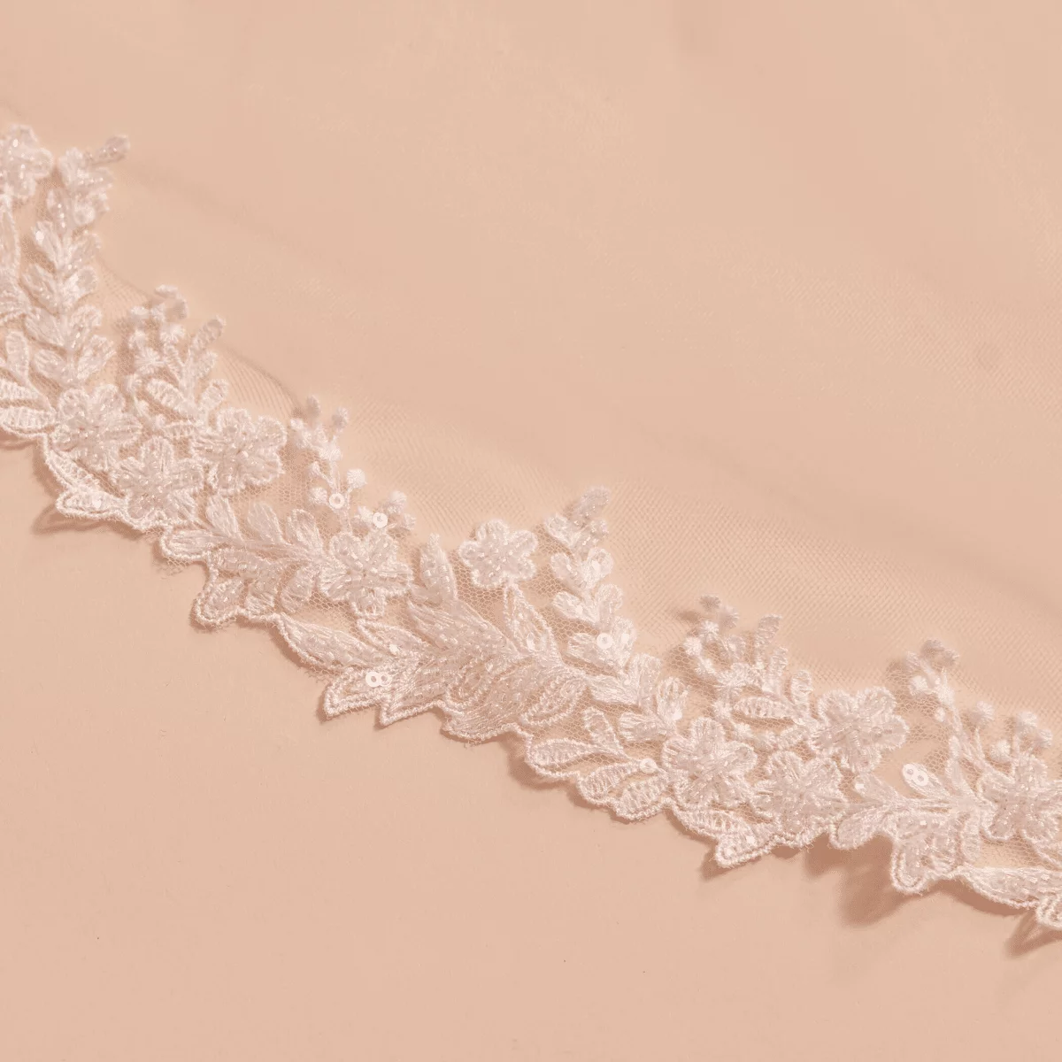 Schöner Brautschleier S409 von Avalia (Bianco Evento) aus Soft-Tüll und Spitze in der Farbe Ivory mit eleganter Spitzenkante. Der Schleier ist einlagig und hat eine Länge von 110 cm. Die hochwertige Spitze ist mit schönen Glasperlen verziert, die bei Lichteinfall glänzen. Der eingearbeitete Haarkamm sorgt dafür, dass der Schleier bequem an der Kopffrisur haftet. Dieses Accessoire wurde entworfen und produziert in der Europäischen Union.