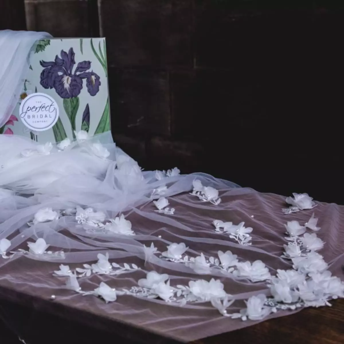 Der wunderschöne Schleier PBV9030 von The Perfect Bridal Company aus der Kollektion 2022 ergänzt ideal Deinen Brautlook! Hergestellt aus ultraweichem Tüll (Soft-Tüll) in der Farbe Ivory (Elfenbeinfarbe). Verziert mit zarten Spitzenmotiven mit wunderschönen 3D-Blumen und Perlen, die die Schleppe hinunterfließen.