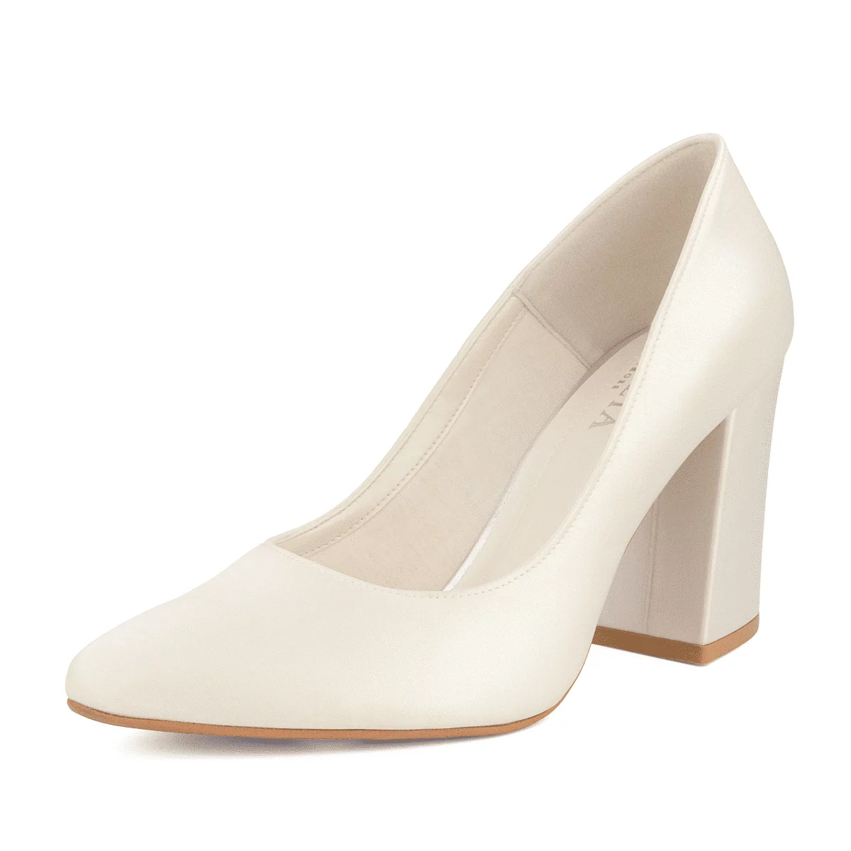 Die Brautschuhe Astra von Avalia in der klassischen Farbe Ivory bestehen aus hochwertigem Satin mit einem breiten Absatz. Dank dem weichen Innenfutter aus Schaumstoff sind die Brautschuhe Astra besonders bequem und bieten maximalen Tragekomfort. Die Absatzhöhe von 12 cm sorgt für optisch gestreckte Beine und macht diese Brautschuhe zum Highlight jeder Hochzeitsfeier. Trotz dem hohen Absatz sind die Hochzeitsschuhe Astra aus Satin mit breitem Absatz sehr bequem und haben einen verstellbaren Knöchelriemen, damit diese an nahezu jeden Fuß perfekt sitzen. Die Farbe Ivory ist wunderschön und passt zum weißen oder elfenbeinfarbigen Brautkleid. Da es sich um Brautschuhe mit einem hohen Absatz handelt, spielt die Kleidlänge übrigens keine entscheidende Rolle. Diese hochwertigen Brautschuhe Astra Ivory von dem Hersteller Avalia (Bianco Evento) wurden sorgfältig entworfen und hergestellt in Europa.