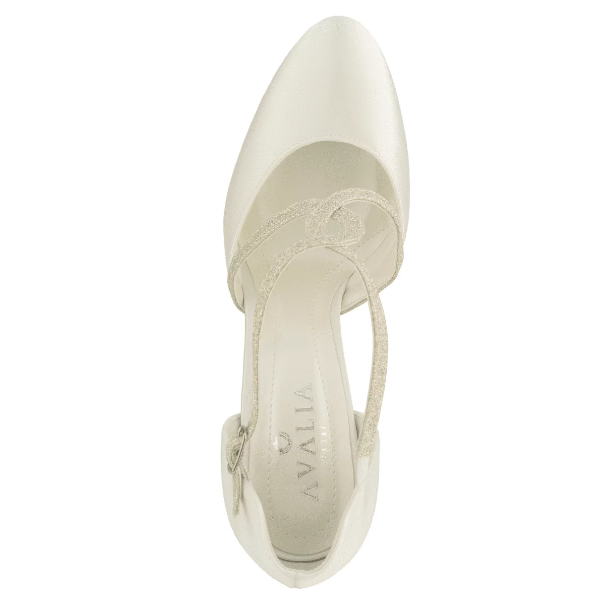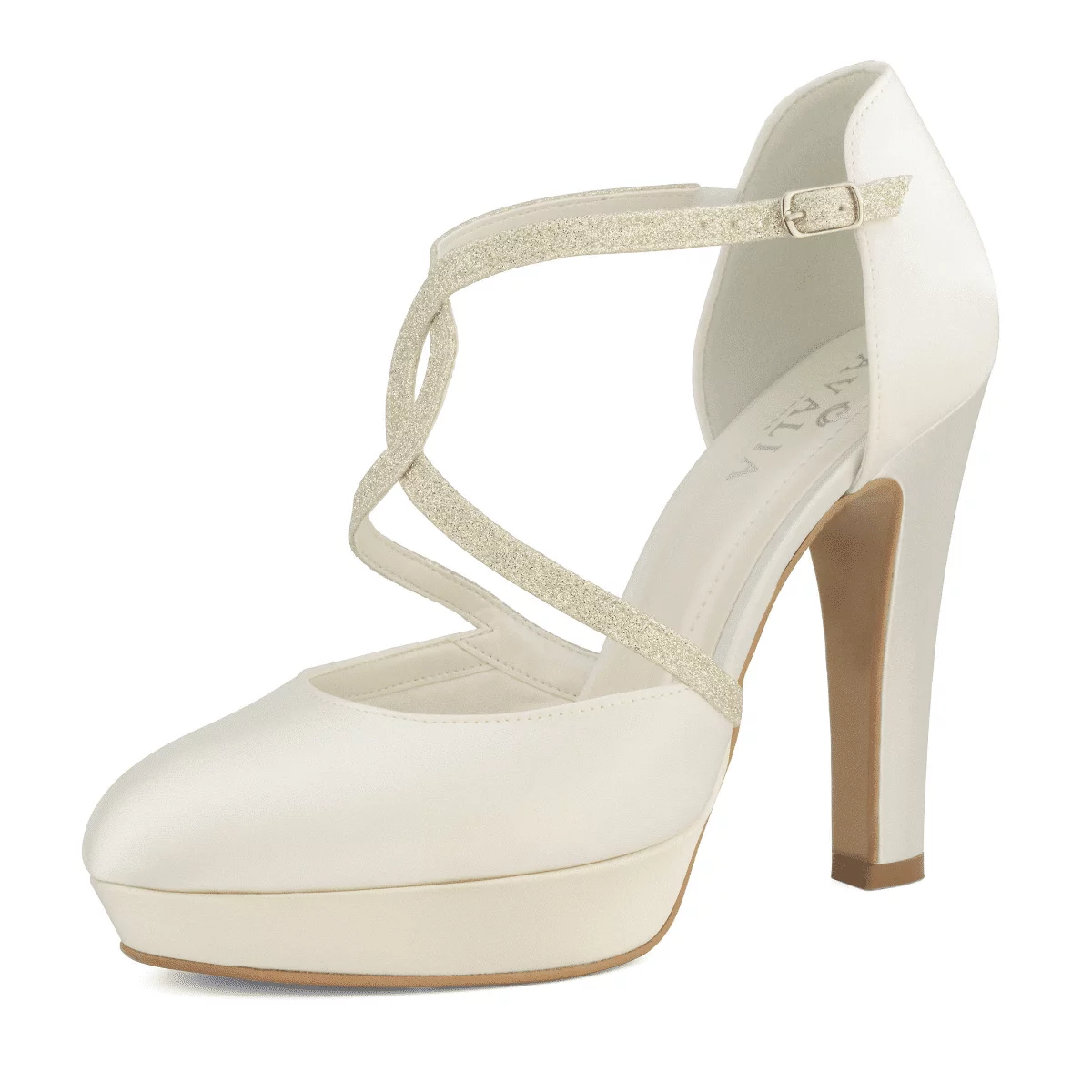 Die Brautschuhe Kim von Avalia in der klassischen Farbe Ivory bestehen aus hochwertigem Satin mit einem breiten Absatz. Dank dem weichen Innenfutter aus Schaumstoff sind die Brautschuhe Kim besonders bequem und bieten maximalen Tragekomfort. Die Absatzhöhe von 12,5 cm und Plateuhöhe von 2 cm ist für Bräute geeignet, die das Laufen auf High-Heels gut beherrschen. Der hohe Absatz sorgt für optisch gestreckte Beine und macht diese Brautschuhe zum Highlight jeder Hochzeitsfeier. Trotz dem hohen Absatz sind die Hochzeitsschuhe Kim High-Heels aus Satin sehr bequem und haben einen verstellbaren Knöchelriemen, damit diese an nahezu jedem Fuß perfekt sitzen. Die Farbe Ivory ist wunderschön und passt zum weißen oder elfenbeinfarbigen Brautkleid. Da es sich um Brautschuhe mit einem hohen Absatz handelt, spielt die Kleidlänge übrigens keine entscheidende Rolle. Diese hochwertigen Brautschuhe Kim Ivory von dem Hersteller Avalia (Bianco Evento) wurden sorgfältig entworfen und hergestellt in der Europäischen Union.
