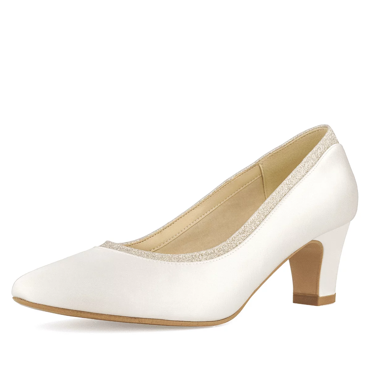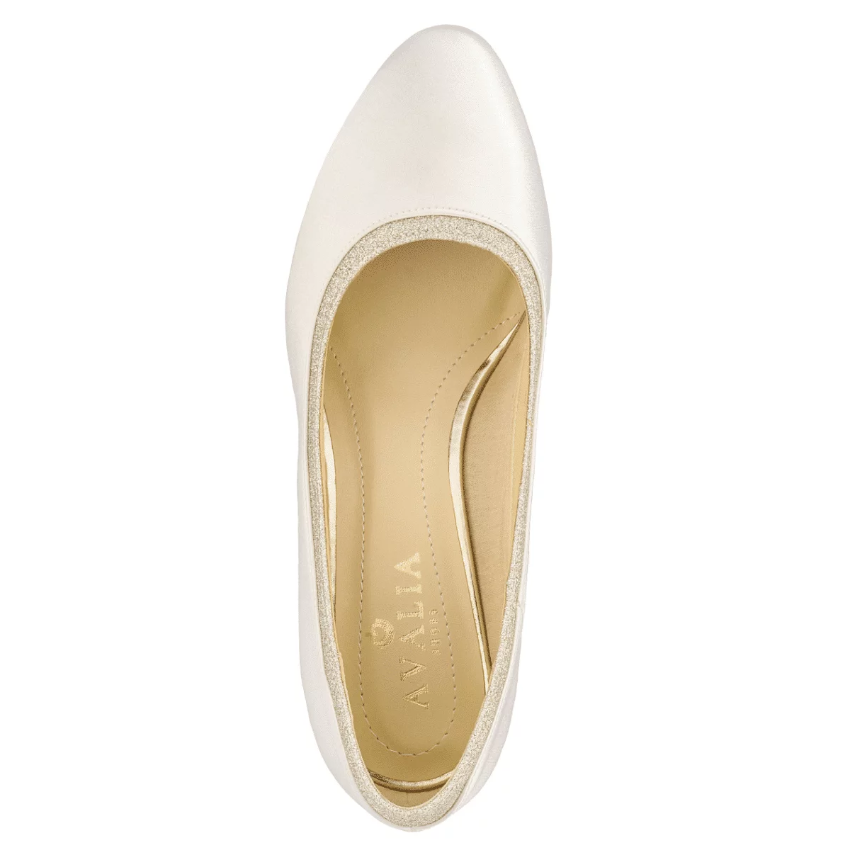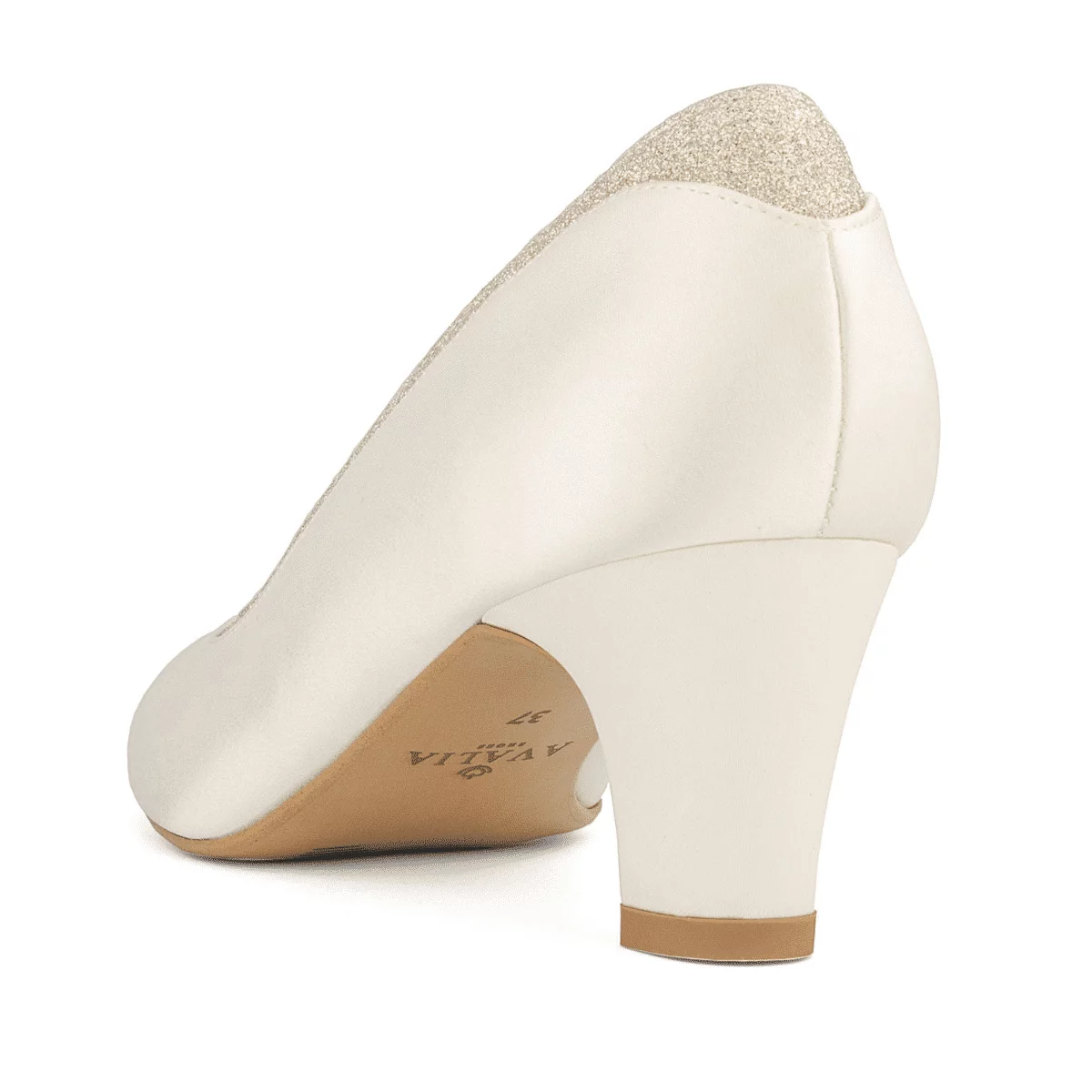 Die Brautschuhe Mandy von Avalia in der klassischen Farbe Ivory bestehen aus hochwertigem Satin mit einem breiten Absatz. Dank dem weichen Innenfutter aus Schaumstoff sind die Brautschuhe Mandy besonders bequem und bieten maximalen Tragekomfort. Die Absatzhöhe von nur 6 cm sorgt für optisch gestreckte Beine und macht diese Brautschuhe zum Highlight jeder Hochzeitsfeier. Trotz dem Absatz sind die Hochzeitsschuhe Mandy aus Satin mit breitem Absatz sehr bequem. Die Farbe Ivory ist wunderschön und passt zum weißen oder elfenbeinfarbigen Brautkleid. Diese Brautschuhe sehen zu einem langen Brautkleid besonders schön aus, können auch zu manchen kurzen Brautkleidern getragen werden. Diese hochwertigen Brautschuhe Mandy Ivory von dem Hersteller Avalia (Bianco Evento) wurden sorgfältig entworfen und hergestellt in der Europäischen Union.
