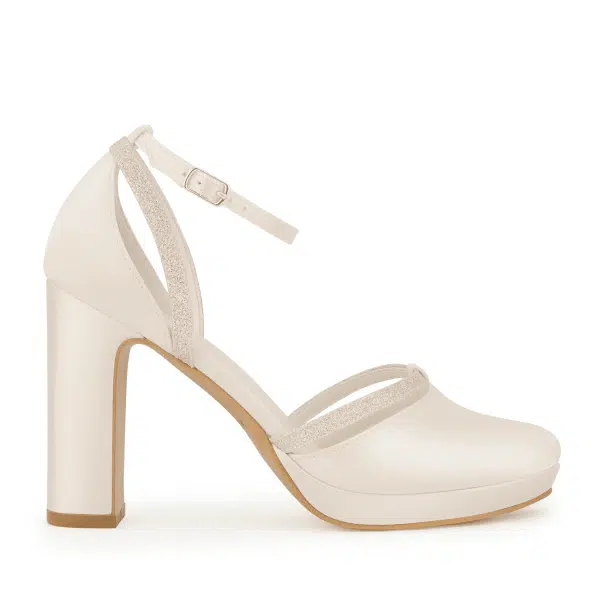 Die Brautschuhe Mary von Avalia in der klassischen Farbe Ivory bestehen aus hochwertigem Satin mit Glitzern mit einem stylischen Blockabsatz. Dank dem weichen Innenfutter aus Schaumstoff sind die Brautschuhe Mary besonders bequem und bieten maximalen Tragekomfort. Der hohe Absatz von 10cm sorgt für optisch gestreckte Beine und bietet gleichzeitig einen hohen Komfort beim Laufen und Stehen. Die Hochzeitsschuhe Mary aus Satin sind sehr bequem und haben einen verstellbaren Knöchelriemen, damit diese an nahezu jedem Fuß perfekt sitzen. Die Farbe Ivory ist wunderschön und passt zum weißen oder elfenbeinfarbigen Brautkleid. Brautschuhe mit einem hohen Absatz sind sowohl für lange wie auch für kurze Brautkleider ideal geeignet. Diese hochwertigen Brautschuhe Mary Ivory von dem Hersteller Avalia (Bianco Evento) wurden sorgfältig entworfen und hergestellt in der Europäischen Union.