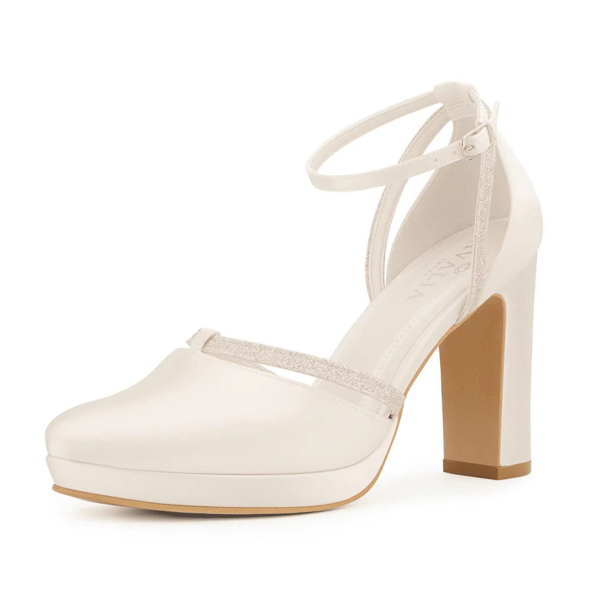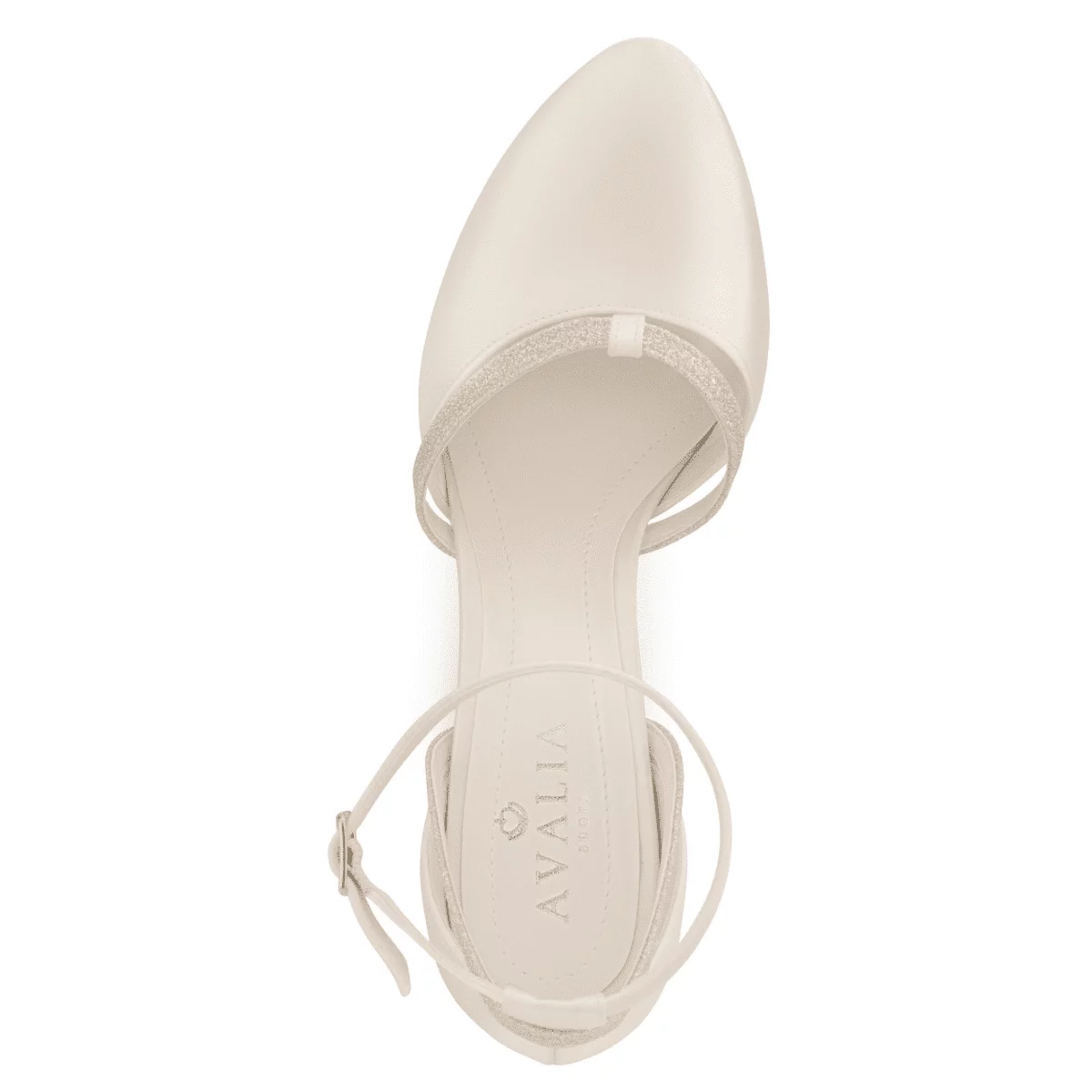 Die Brautschuhe Mary von Avalia in der klassischen Farbe Ivory bestehen aus hochwertigem Satin mit Glitzern mit einem stylischen Blockabsatz. Dank dem weichen Innenfutter aus Schaumstoff sind die Brautschuhe Mary besonders bequem und bieten maximalen Tragekomfort. Der hohe Absatz von 10cm sorgt für optisch gestreckte Beine und bietet gleichzeitig einen hohen Komfort beim Laufen und Stehen. Die Hochzeitsschuhe Mary aus Satin sind sehr bequem und haben einen verstellbaren Knöchelriemen, damit diese an nahezu jedem Fuß perfekt sitzen. Die Farbe Ivory ist wunderschön und passt zum weißen oder elfenbeinfarbigen Brautkleid. Brautschuhe mit einem hohen Absatz sind sowohl für lange wie auch für kurze Brautkleider ideal geeignet. Diese hochwertigen Brautschuhe Mary Ivory von dem Hersteller Avalia (Bianco Evento) wurden sorgfältig entworfen und hergestellt in der Europäischen Union.