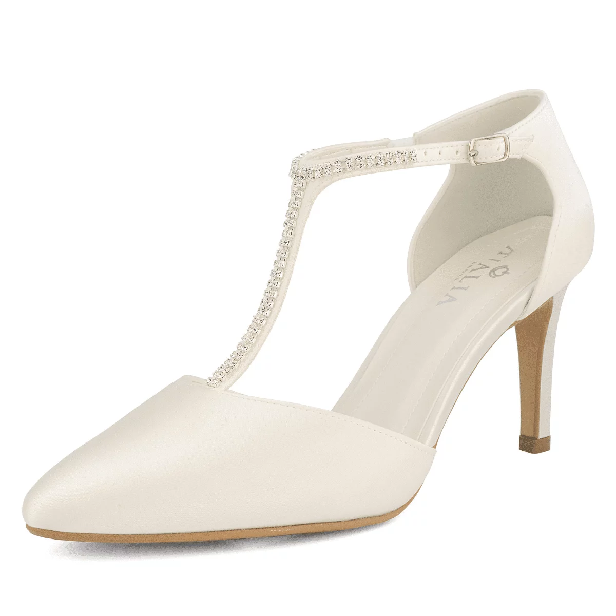 Die Brautschuhe Rosie von Avalia in der klassischen Farbe Ivory bestehen aus hochwertigem Satin mit einem stylischen Pfennigabsatz. Mit hochwertigen Kristallen, die bei Lichteinfall schimmern. Dank dem weichen Innenfutter aus Schaumstoff sind die Brautschuhe Rosie besonders bequem und bieten maximalen Tragekomfort. Die Absatzhöhe von 8,5 cm sorgt für optisch gestreckte Beine und macht diese Brautschuhe zum Highlight jeder Hochzeitsfeier. Trotz dem hohen Absatz sind die Hochzeitsschuhe Rosie High-Heels aus Satin sehr bequem und haben einen verstellbaren Knöchelriemen, damit diese an nahezu jedem Fuß perfekt sitzen. Die Farbe Ivory ist wunderschön und passt zum weißen oder elfenbeinfarbigen Brautkleid. Da es sich um Brautschuhe mit einem hohen Absatz handelt, spielt die Kleidlänge übrigens keine entscheidende Rolle. Diese hochwertigen Brautschuhe Rosie Ivory von dem Hersteller Avalia (Bianco Evento) wurden sorgfältig entworfen und hergestellt in der Europäischen Union.