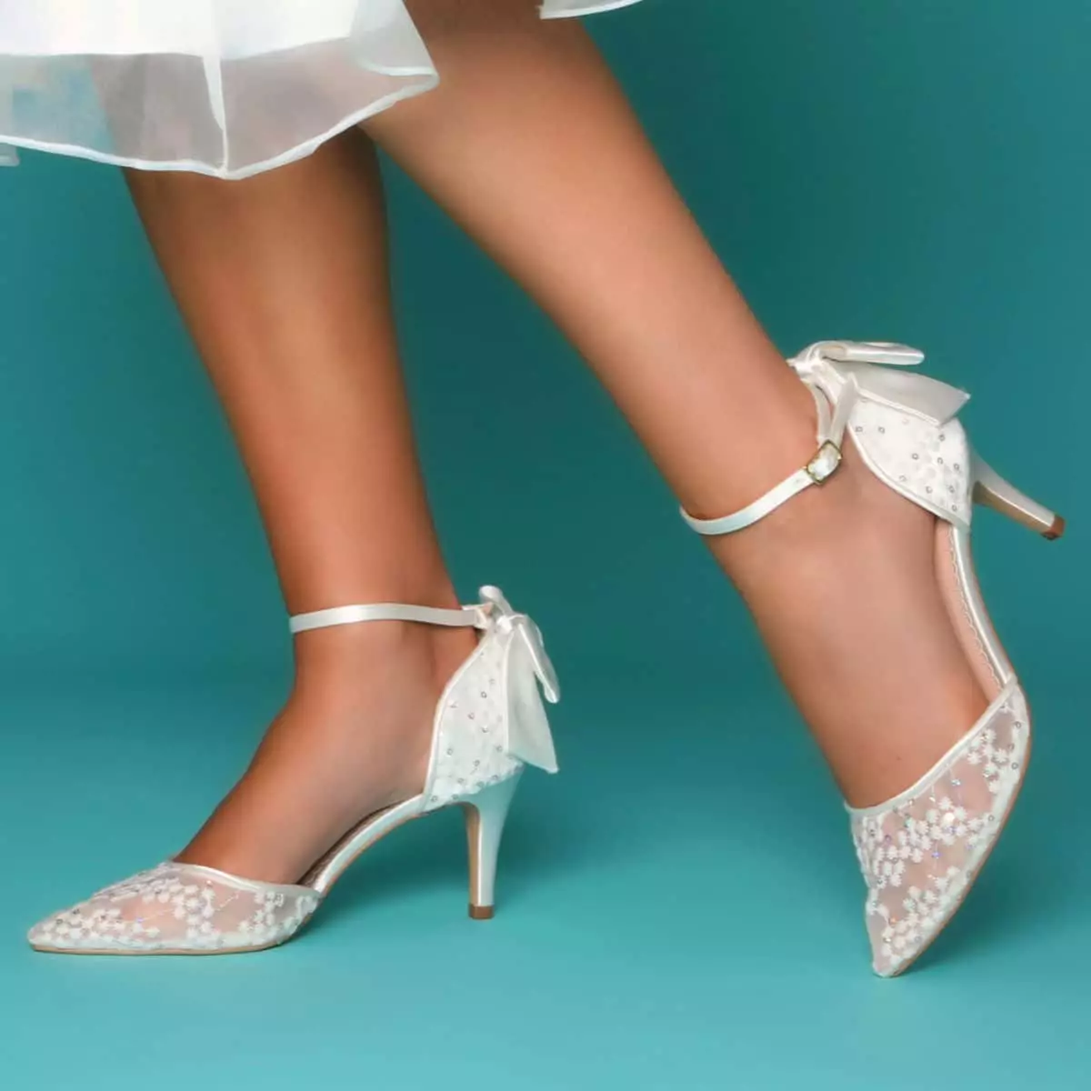 Elegante Brautschuhe Florence aus hochwertigem Satin und feiner Spitze, die mit zarten Pailletten verziert ist. Die stilvolle Satinschleife auf der Rückseite des Schuhs hebt das zarte Design besonders hervor. Diese Pumps von The Perfect Bridal Company sind der absolute Hingucker und rücken nahezu jedes Brautoutfit in den Vordergrund. Dank dem 7,5 cm Pfennigabsatz sorgen sie für optisch gestreckte Beine und sind dennoch sehr bequem beim Tragen. Für den besonderen Tragekomfort sorgt die Innensohle aus echtem Leder mit einer Polsterung.
