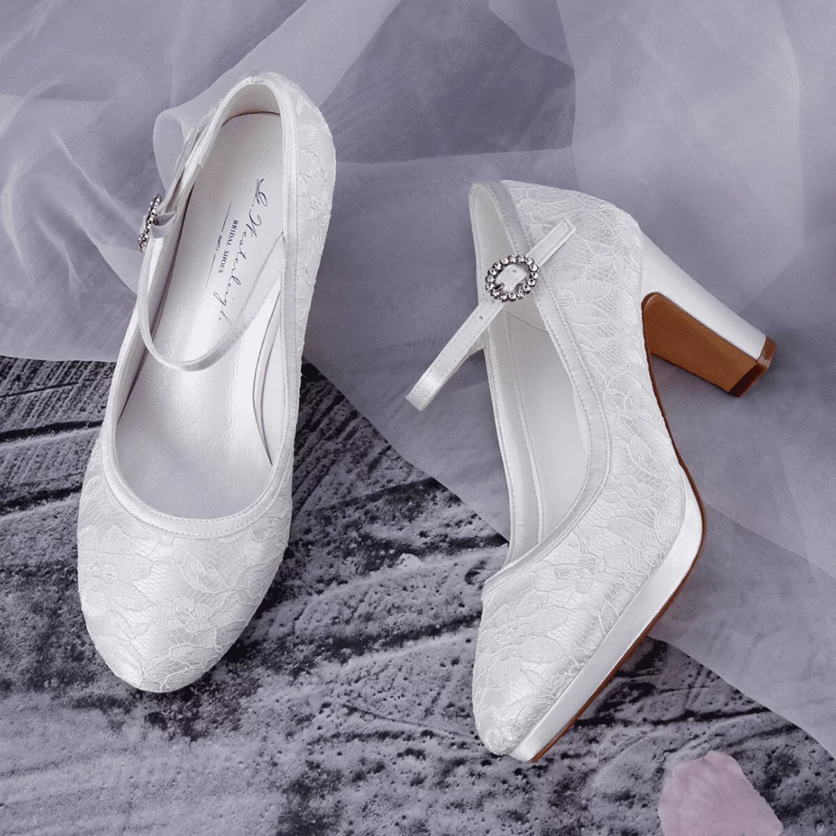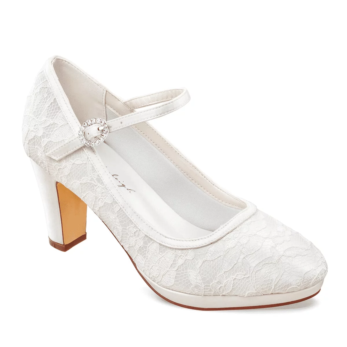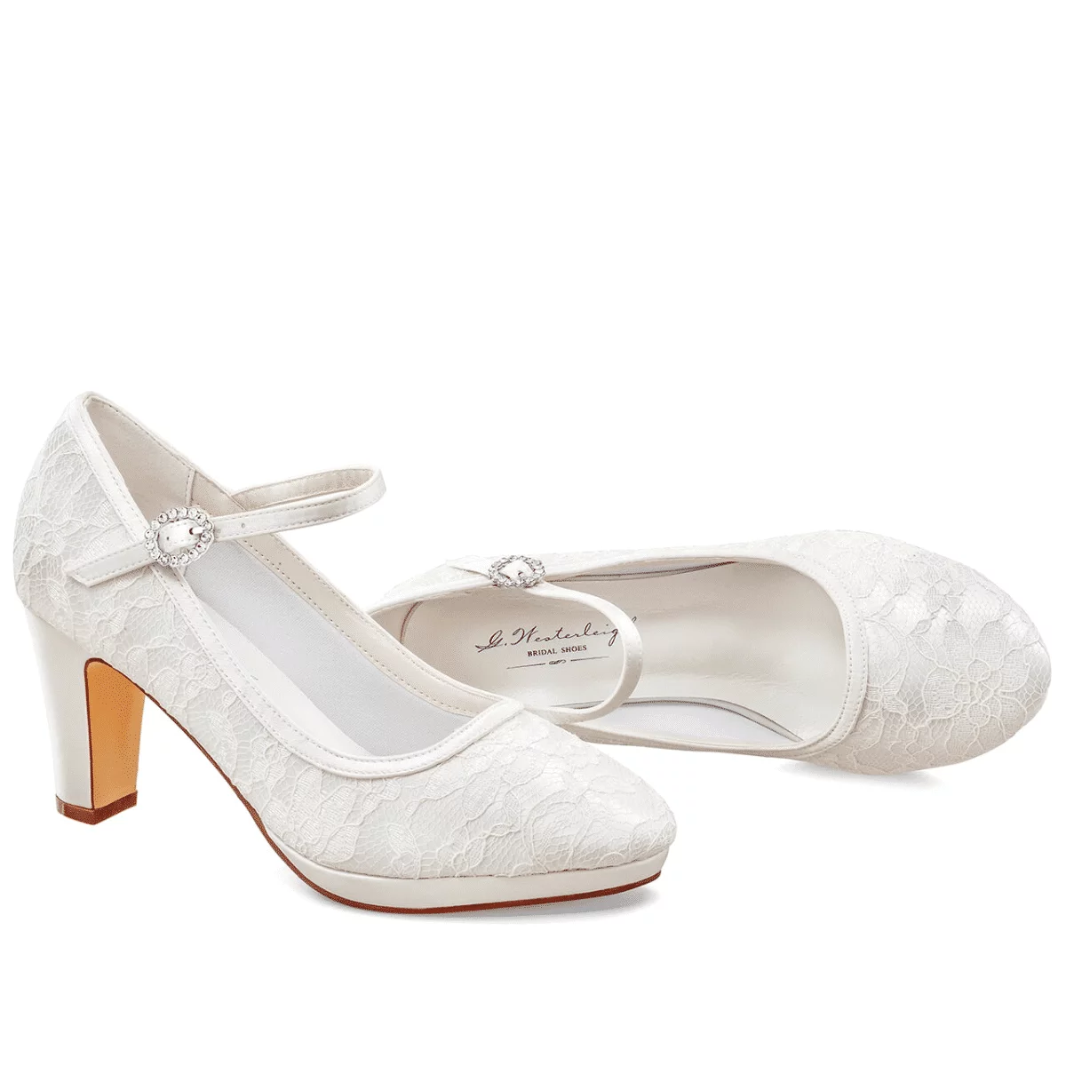 Die Innensohle besteht aus hochwertigem Leder und kommt mit einer weichen Gel-Polsterung für eine ideale Passform. Dadurch kann die Braut mit diesen Schuhen bequem laufen und stehen. Der hohe und stabile Blockabsatz von 7,5 cm sorgt dafür, dass die Brautschuhe Alessia von G. Westerleigh sehr bequem zu tragen sind. Die Brautschuhe Alessia sind aus hochwertigem Satin hergestellt und mit feiner Spitze überzogen. Eine ideale Wahl für jede Braut oder Brautjungfern, die im Mittelpunkt der Feier stehen möchte.
