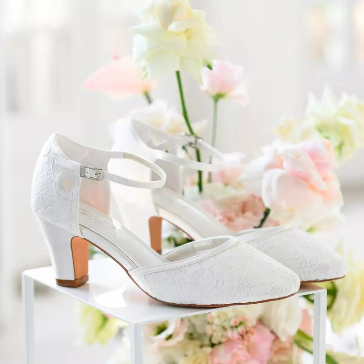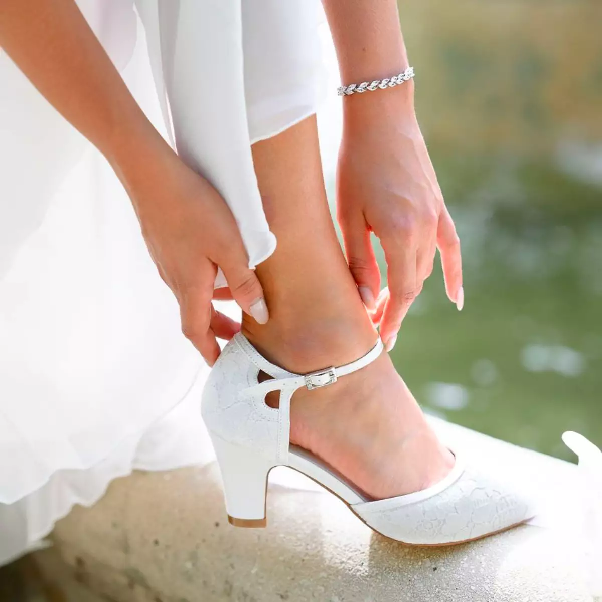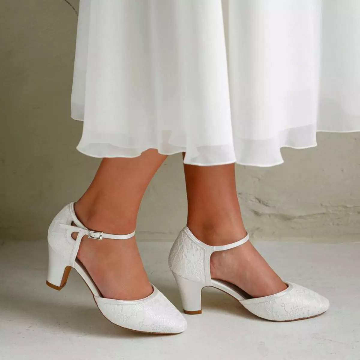 Die Brautschuhe Chrissy von G. Westerleigh kommen in einem klassischen Stil mit einem Hauch Eleganz. In Handarbeit gefertigt aus hochwertigem Satin und zarter Spitze in Farbe Ivory (Elfenbein). Die weiche Gel-Polsterung und die Lederinnensohle sorgen für ein angenehmes Tragegefühl und ideale Passform. Das Modell Chrissy aus der Kollektion 2023 ist die ideale Wahl für Brautjungfern und Bräute, die auf der Suche nach klassischen Schuhen mit Spitzebezug sind. Der etwas höhere und dennoch stabile Trichterabsatz von 7 cm sorgt dafür, dass die Brautschuhe Chrissy von G. Westerleigh sehr bequem zu tragen sind.