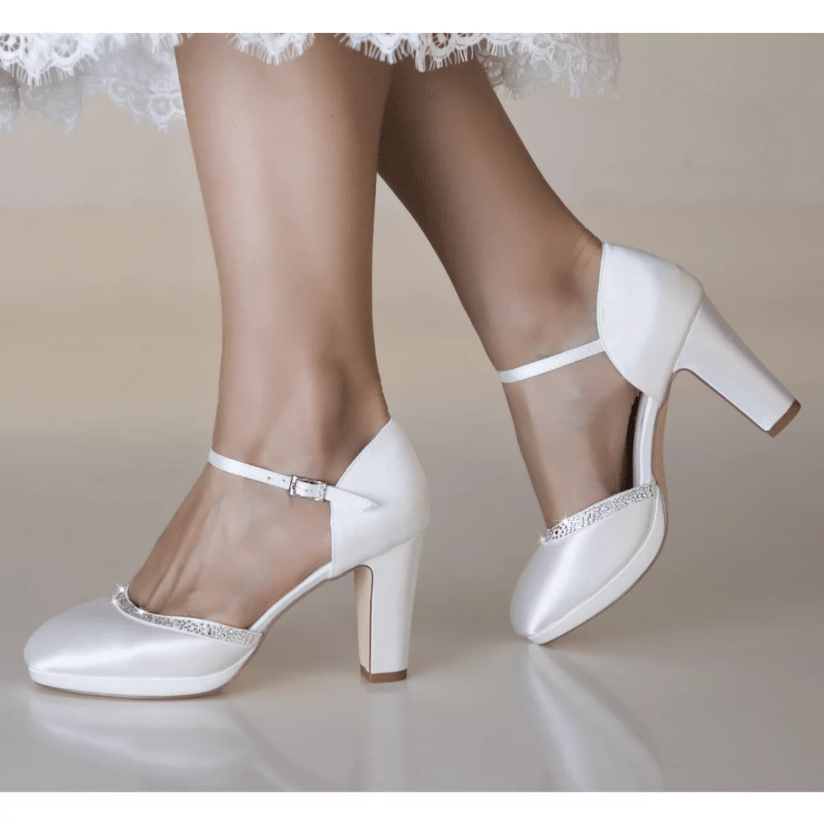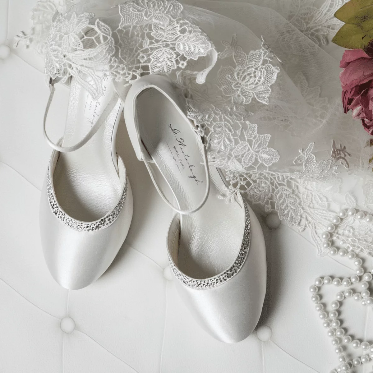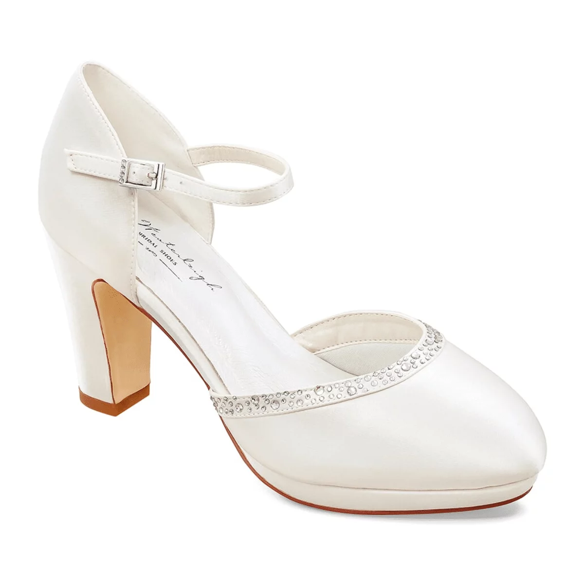 Die Innensohle besteht aus hochwertigem Leder und kommt mit einer weichen Gel-Polsterung für eine ideale Passform. Dadurch kann die Braut mit diesen Schuhen bequem laufen und stehen. Der hohe und dennoch stabile Blockabsatz von nur 8,5 cm sorgt dafür, dass die Brautschuhe Gabrielle von G. Westerleigh sehr bequem zu tragen sind. Dadurch sind diese Schuhe auch als zweites Ersatzpaar gut geeignet. Die Brautschuhe Gabrielle sind aus hochwertigem Satin hergestellt und mit funkelnden Kristallsteinen verziert. Eine ideale Wahl für jede Braut oder Brautjungfern, die im Mittelpunkt der Feier stehen möchte.