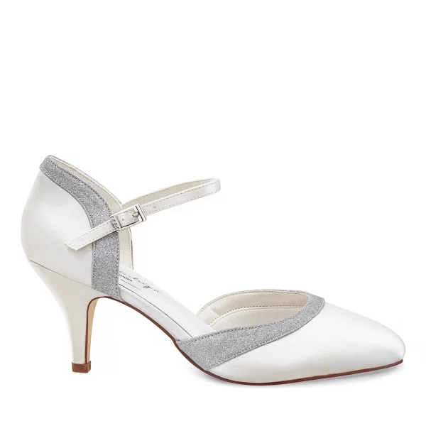 Die Brautschuhe Helena von G. Westerleigh sind aus hochwertigem Satin in der klassischen Farbe Ivory mit stylischen Glitzern in Farbe Silber vorne und hinten gefertigt. Die Farbe der Schuhe eignet sich ideal zu einem Brautkleid in der selben Farbe Ivory (Elfenbeinfarbe) oder Weiß. Silberne Elemente am Brautkleid oder silberner Schmuck ergänzt ideal diese hübschen Brautschuhe. Die Länge des Brautkleids spielt bei diesem Modell übrigens keine entscheidende Rolle. Die Brautschuhe Helena können sowohl zu einem langen wie auch zu einem kurzen Brautkleid getragen werden.