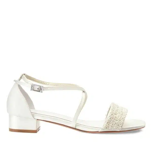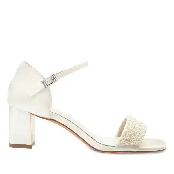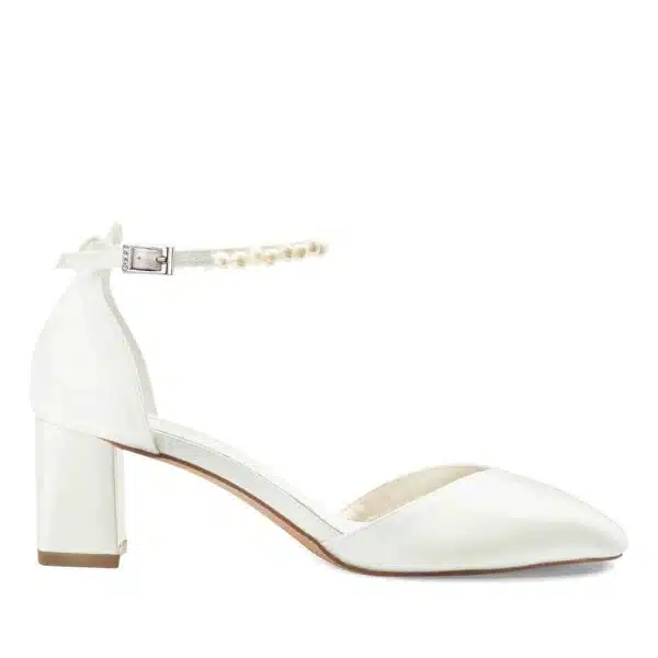 Elegante und sehr bequeme Brautschuhe Layla von G. Westerleigh in einem trendigen Look. In Handarbeit gefertigt aus hochwertigem Satin in der Farbe Ivory und vorne mit creme Perlen verziert. Die weiche Gel-Polsterung und die Lederinnensohle sorgen für eine bequeme Passform und einen hohen Komfort. Das Modell Layla aus der Kollektion 2023 ist die ist die perfekte Wahl für Gartenhochzeiten. Der kleine und stabile Blockabsatz von ca. 3,3 cm und ein verstellbarer Riemen sorgen für hohen Tragekomfort und ein angenehmes Tragegefühl.