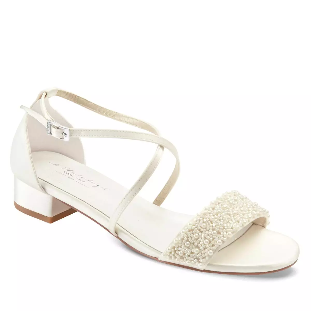 Elegante und sehr bequeme Brautschuhe Layla von G. Westerleigh in einem trendigen Look. In Handarbeit gefertigt aus hochwertigem Satin in der Farbe Ivory und vorne mit creme Perlen verziert. Die weiche Gel-Polsterung und die Lederinnensohle sorgen für eine bequeme Passform und einen hohen Komfort. Das Modell Layla aus der Kollektion 2023 ist die ist die perfekte Wahl für Gartenhochzeiten. Der kleine und stabile Blockabsatz von ca. 3,3 cm und ein verstellbarer Riemen sorgen für hohen Tragekomfort und ein angenehmes Tragegefühl.