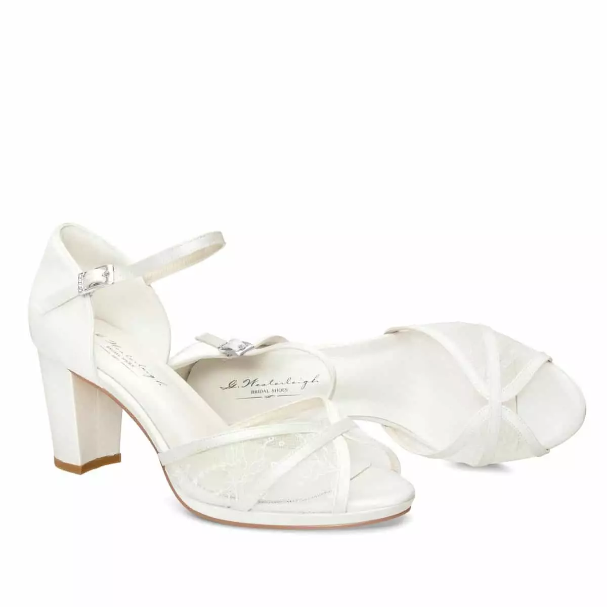 Exklusive Brautschuhe Madeline in der klassischen Farbe Ivory (Elfenbeinfarbe) aus der aktuellen Kollektion von G. Westerleigh. In Handarbeit gefertigt aus hochwertiger Spitze mit einem durchscheinenden Spitzenüberzug. Das Vorderteil ist mit einem romantischen Blumenmuster verziert. Die weiche Gel-Polsterung und die Lederinnensohle sorgen für eine wirklich bequeme Passform. Die Schuhe Madeline sind ideale Wahl für Brautjungfern und Bräute.