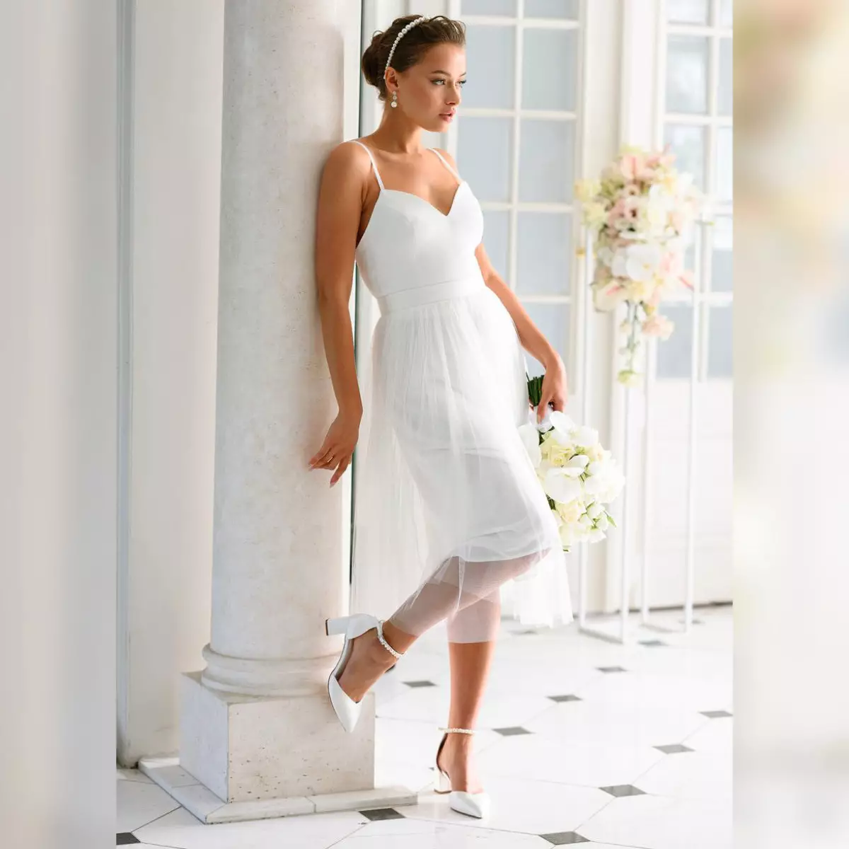 Passend zu diesem Modell empfehlen wir ein Brautkleid in Farbe Ivory sowie weitere Accessoires und Schmuck aus unserem Onlineshop.