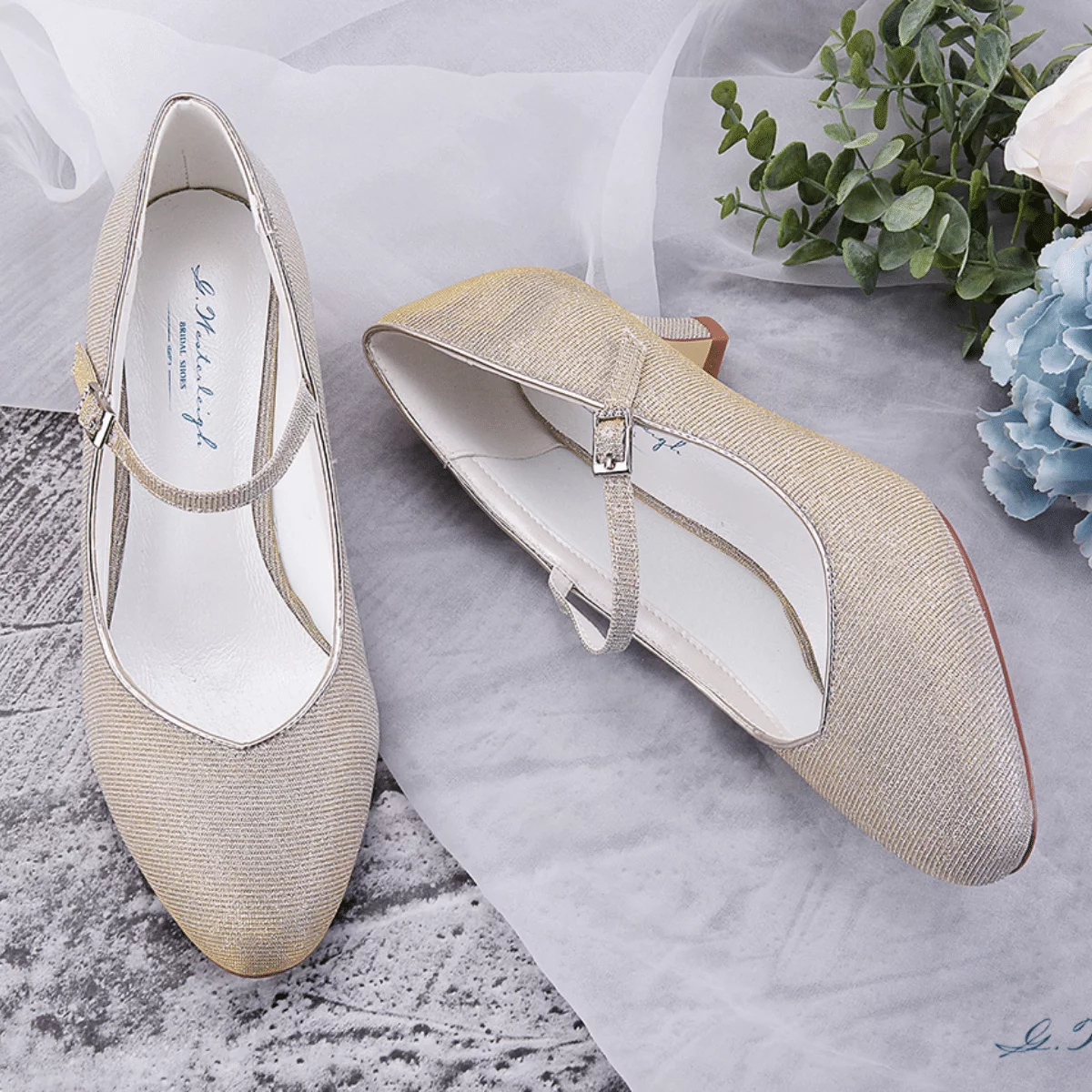 Die hübschen Brautschuhe Marietta von G. Westerleigh sind aus hochwertigem Textil in der Farbe Champagne (Gold) gefertigt. Die Farbe der Schuhe eignet sich ideal zu einem Brautkleid in der Farbe Ivory (Elfenbeinfarbe), Weiß oder einer anderen Farbe. Passender Schmuck und Accessoires in Gold ergänzen ideal diese hübschen Pumps. Passend zu diesen Brautschuhen / Abendschuhen empfehlen wir die passende Handtasche Segovia von G. Westerleigh. Die Länge des Brautkleids spielt bei diesem Modell übrigens keine entscheidende Rolle. Die Brautschuhe Marietta Champagne können sowohl zu einem langen wie auch zu einem kurzen Brautkleid getragen werden.
