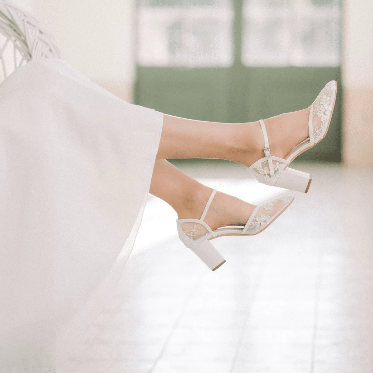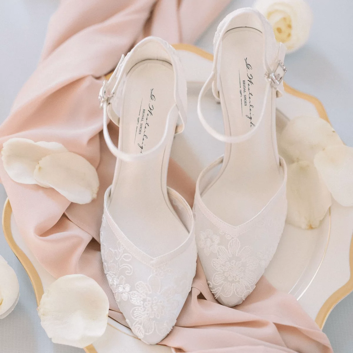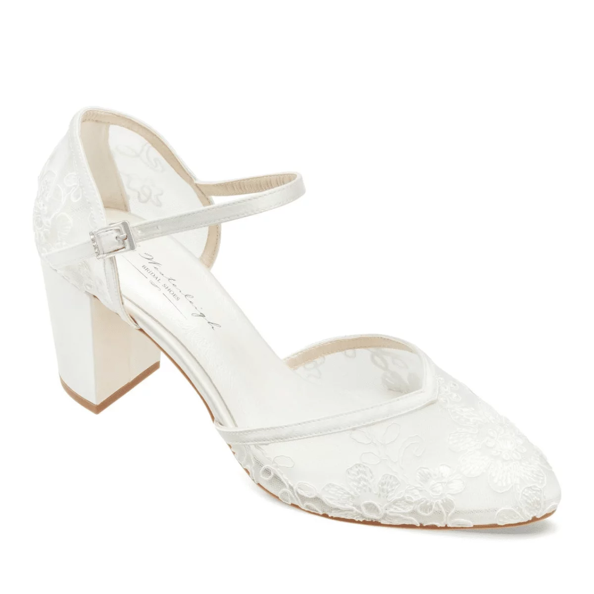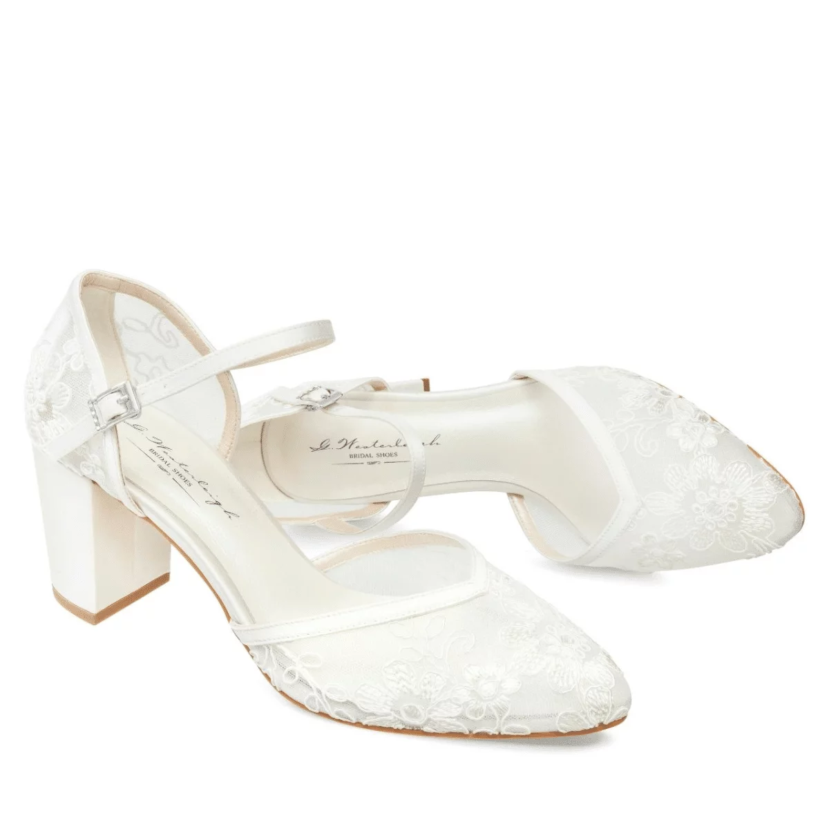 Stylische Brautschuhe Miriam Ivory aus transparenter Spitze in Farbe Ivory (Elfenbeinfarbe). Diese Schuhe sind eine ideale Wahl für Bräute, Brautjungfern und Mütter der Braut oder als Abendschuhe. Der vordere und hintere Teil sind beide mit einem romantischen Blumenmuster verziert. Die Länge des Kleids spielt bei diesem Modell übrigens keine entscheidende Rolle. Die Brautschuhe Miriam können sowohl zu einem langen wie auch zu einem kurzen Brautkleid / Abendkleid getragen werden.