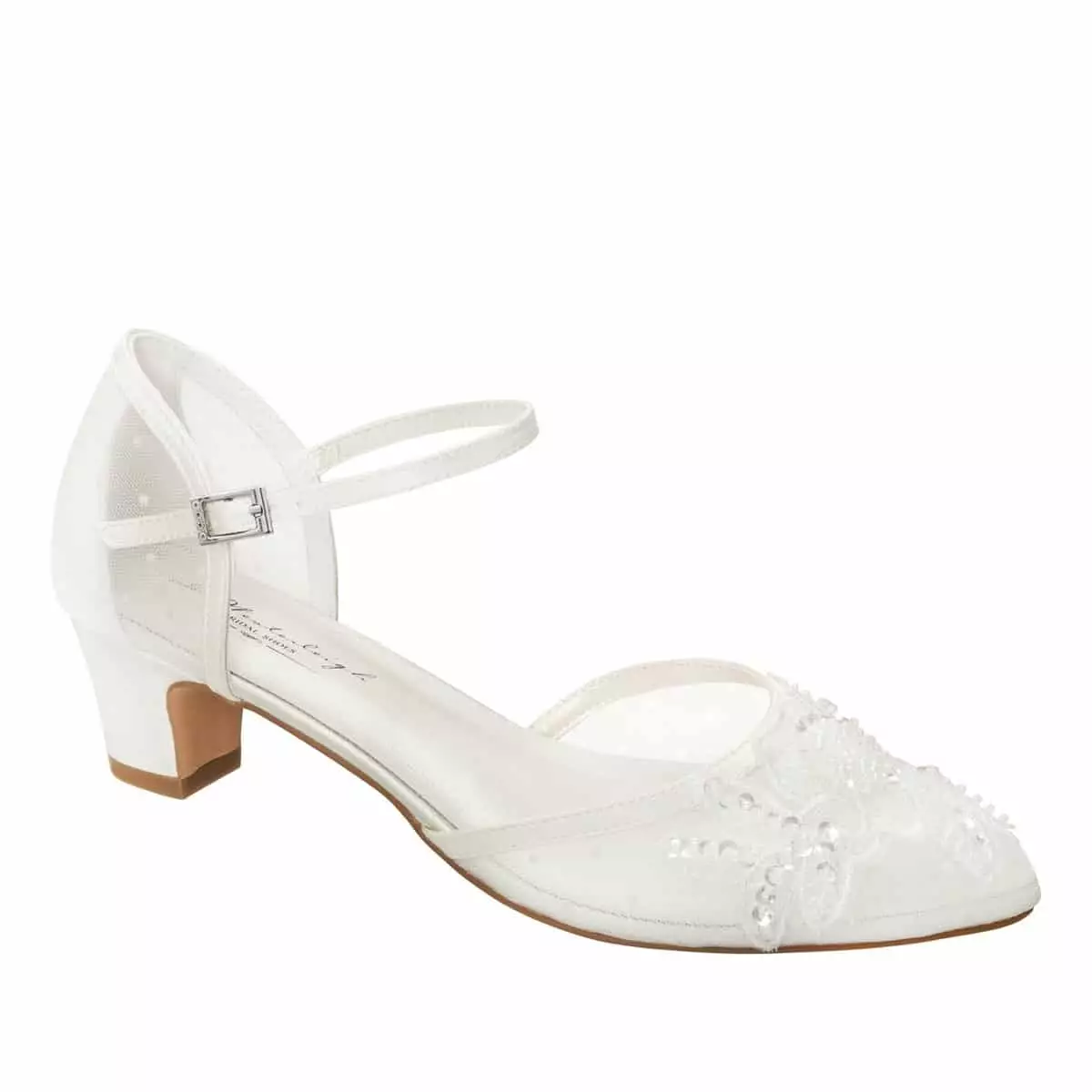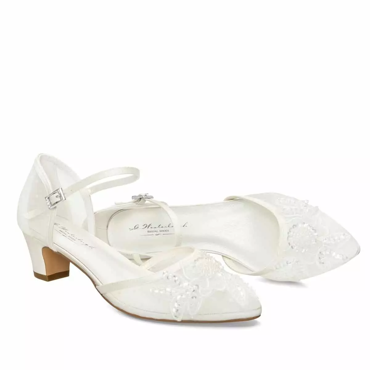 Die eleganten Brautschuhe Polly in einem modernen und trendigen Stil aus der aktuellen Kollektion von G. Westerleigh kommen in der klassischen Farbe Ivory (Elfenbeinfarbe). In Handarbeit gefertigt aus hochwertigem Satin und transparentem Tüllstoff mit Tupfen, handapplizierten Pailletten und eleganter Spitzenverzierung. Die weiche Gel-Polsterung und die Lederinnensohle sorgen für eine wirklich bequeme Passform. Die Sandaletten Polly sind ideale Wahl für Brautjungfern und Bräute. Auch für Sommer- und Gartenhochzeiten empfehlen wir dieses Modell aus Satin und zarter Spitze.