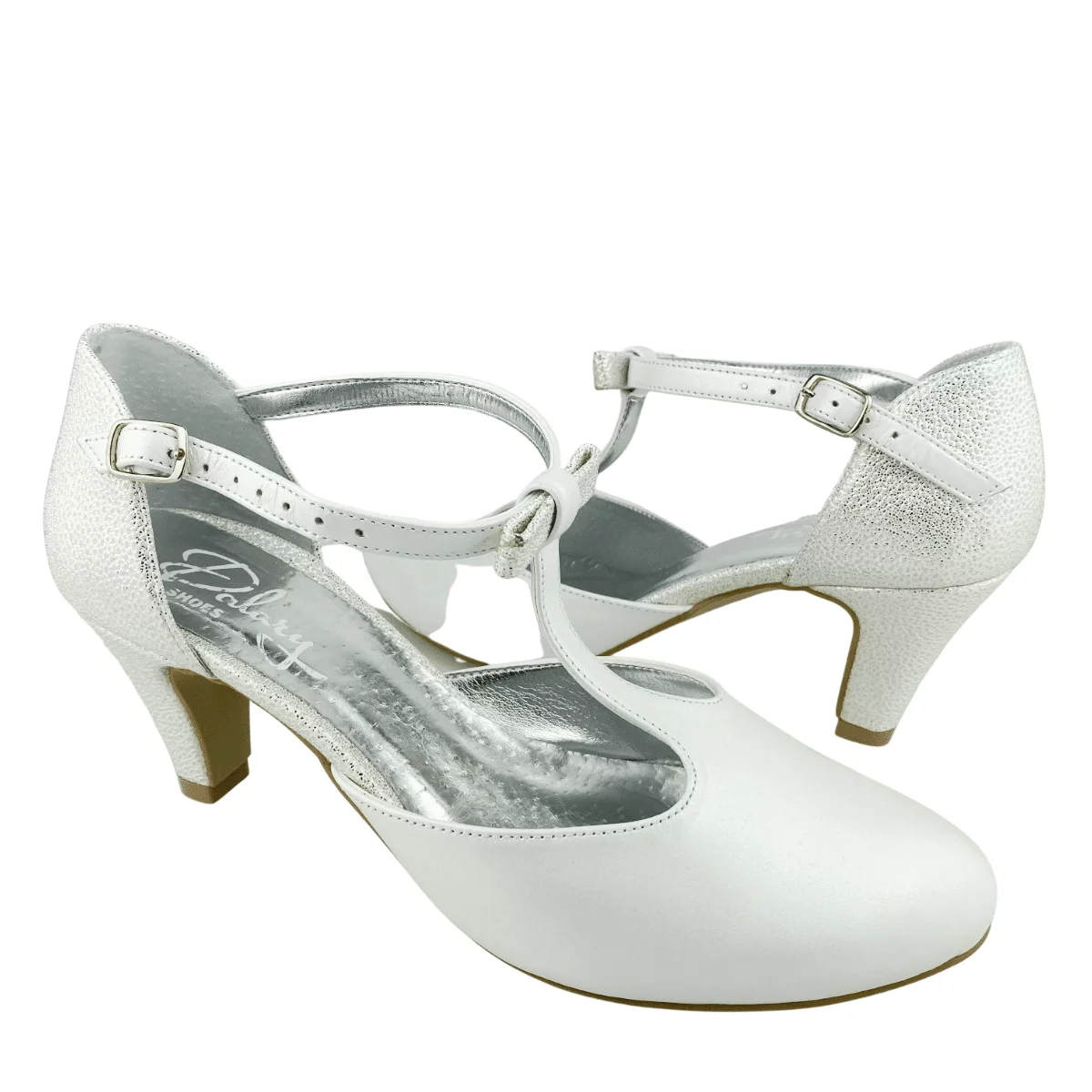 Diese Brautschuhe in der schönen Farbe Weiß sind zu 100% aus Leder. Sowohl das Außenmaterial wie auch das Innenmaterial bestehen aus hochwertigem Leder. Die Brautschuhe Nelly weiß sind im klassischen Design gehalten mit Spitze und 6 cm hohem Absatz. Diese Schuhe sehen besonders stylisch aus und passen sowohl zum kurzen wie auch zum langen Brautkleid. Dank der Latex-Schuhsohle und einem Einsatz in der Ferse sind diese Brautschuhe Nelly weiß besonders bequem. Dadurch wird die Dämpfung der Füße ermöglicht und der Komfort erhöht. Die stilvollen Glitzer-Elemente am Schuh verleihen eine schöne Ergänzung des Brautoutfits und sorgen für Stil und Eleganz. Die Farbe Weiß setzt einen schönen Akzent zum hellen Brautkleid. Die Hochzeitsschuhe Nelly weiß sind nicht nur schön und stylisch, sondern auch sehr bequem. Überzeugen Sie sich durch die hohe Qualität dieser Lederschuhe in Farbe Weiß. Wir sorgen für Freude und ein strahlendes Lächeln der Braut und aller Hochzeitsgäste.