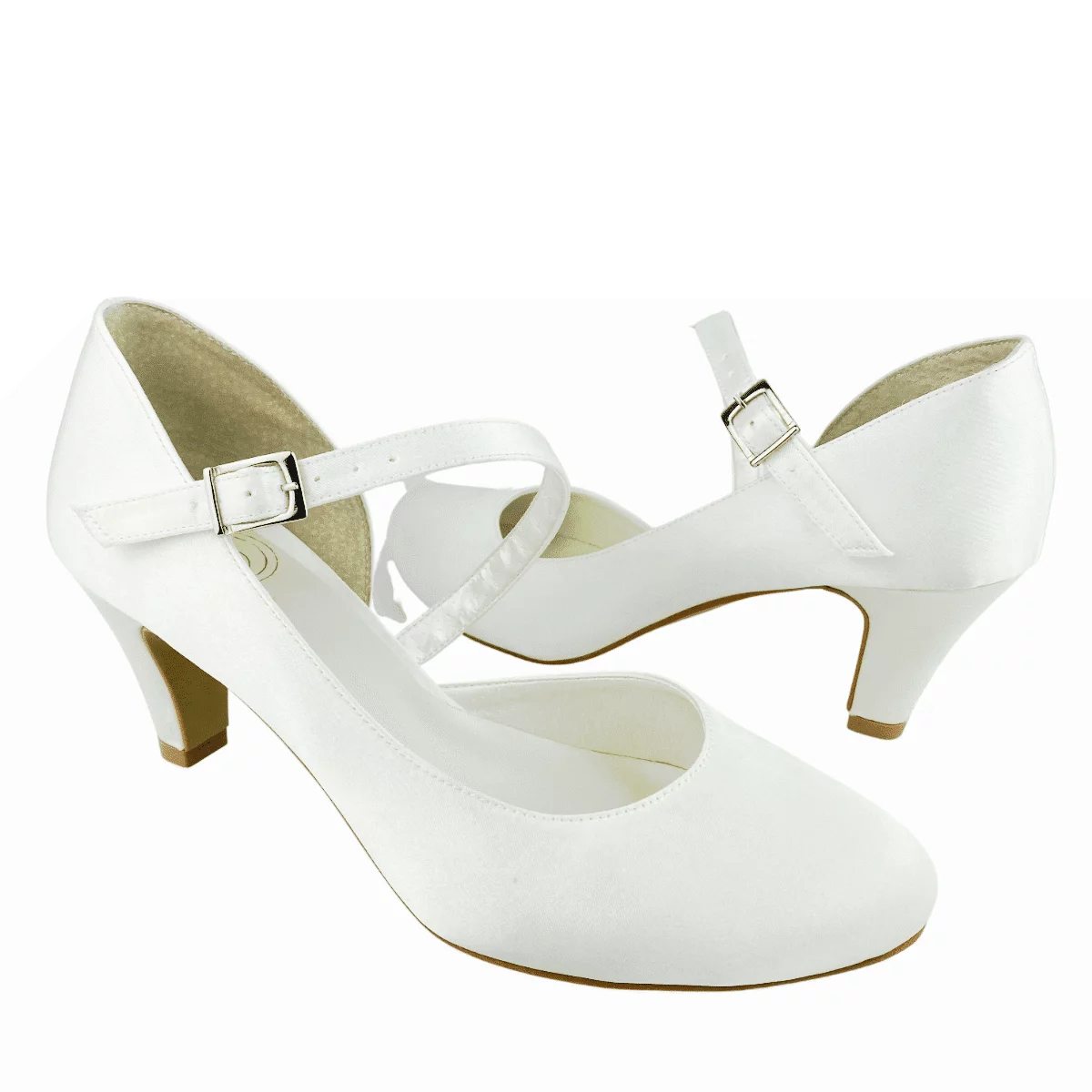 Die stylischen und hübschen Brautschuhe Mira aus hochwertigem Satin kommen mit einem frischen Design mit niedrigem Trichterabsatz. Die Farbe Ivory verleiht dem Brautoutfit ein Hauch von Eleganz und passt ideal zu einem Brautkleid in der selben Farbe Ivory (auch Elfenbeinfarbe genannt) oder der klassischen Farbe Weiß. Dabei spielt die Kleidlänge nur eine zweitrangige Rolle, denn diese wunderschönen Pumps passen sowohl zu einem langen wie auch zu einem kurzen Brautkleid. Brautschuhe Mira aus Satin in Ivory sind dank dem niedrigen Absatz von nur 6 cm und einem Latex-Sohleneinsatz besonders bequem.