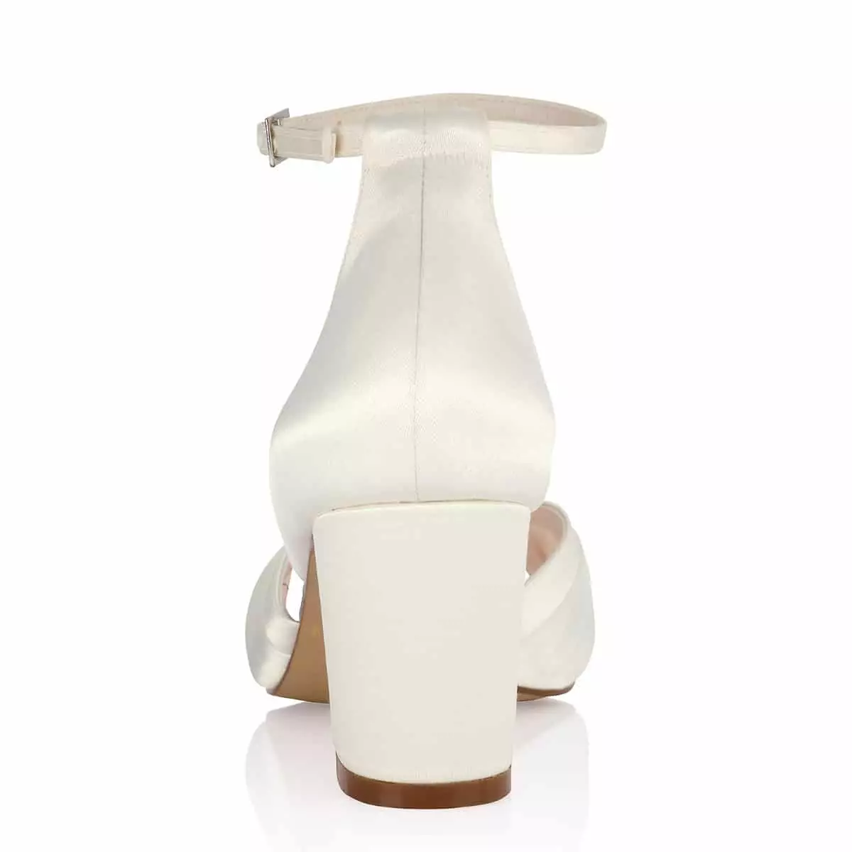 Die Brautschuhe Eliza von Rainbow Club sind wunderschön und besonders bequem! Der 6,5cm hohe Blockabsatz und das weiche Soft Bliss-Futter sorgen für einen festen Stand und idealen Tragekomfort. Ein Fesselriemchen sorgt für zusätzlichen Komfort und sieht sehr stylisch aus! Diese Schuhe sind aus hochwertigem Satin in Farbe Ivory gefertigt, das am Spann in Falten gelegt ist. Ein klassischer Brautschuh mit einem besonderen Design.