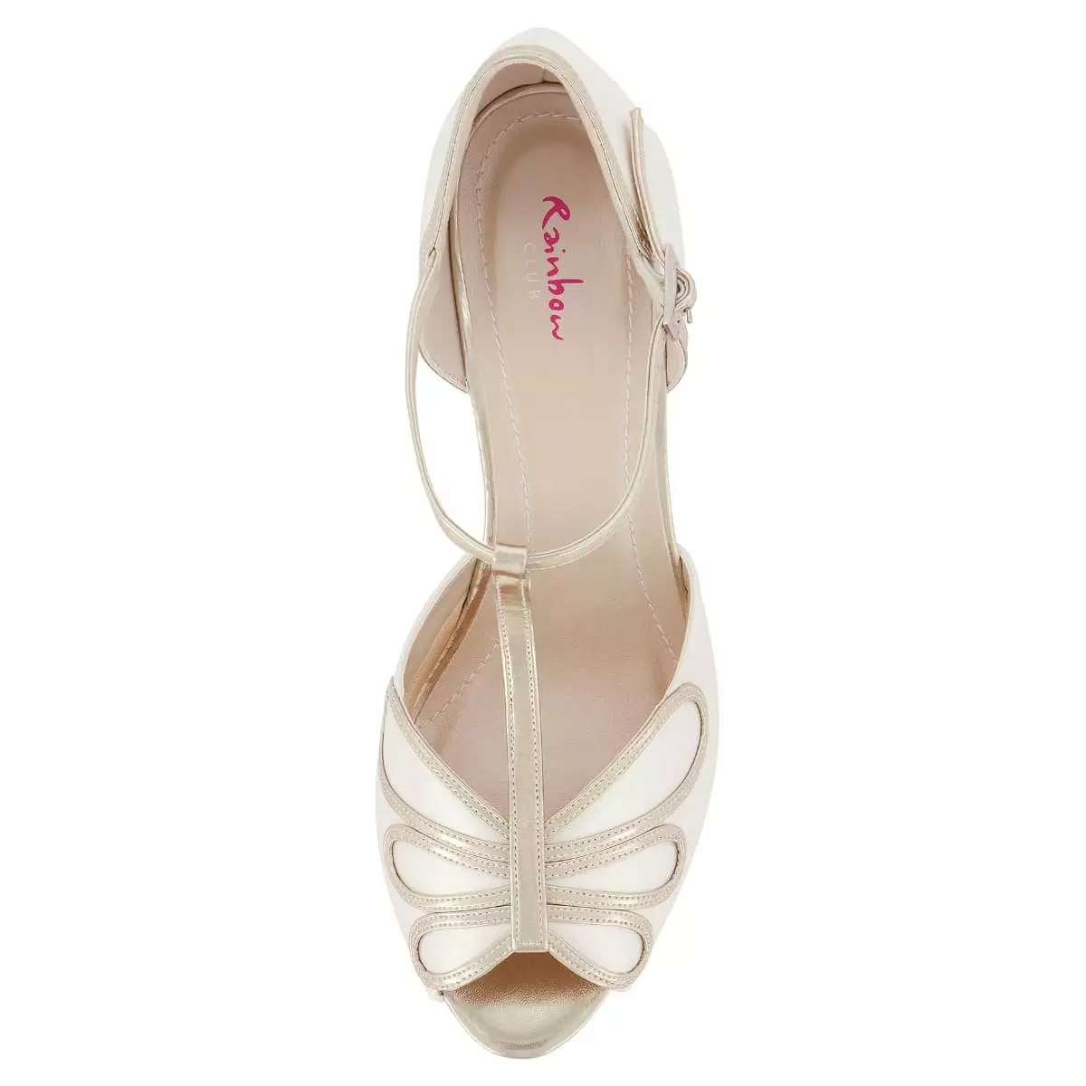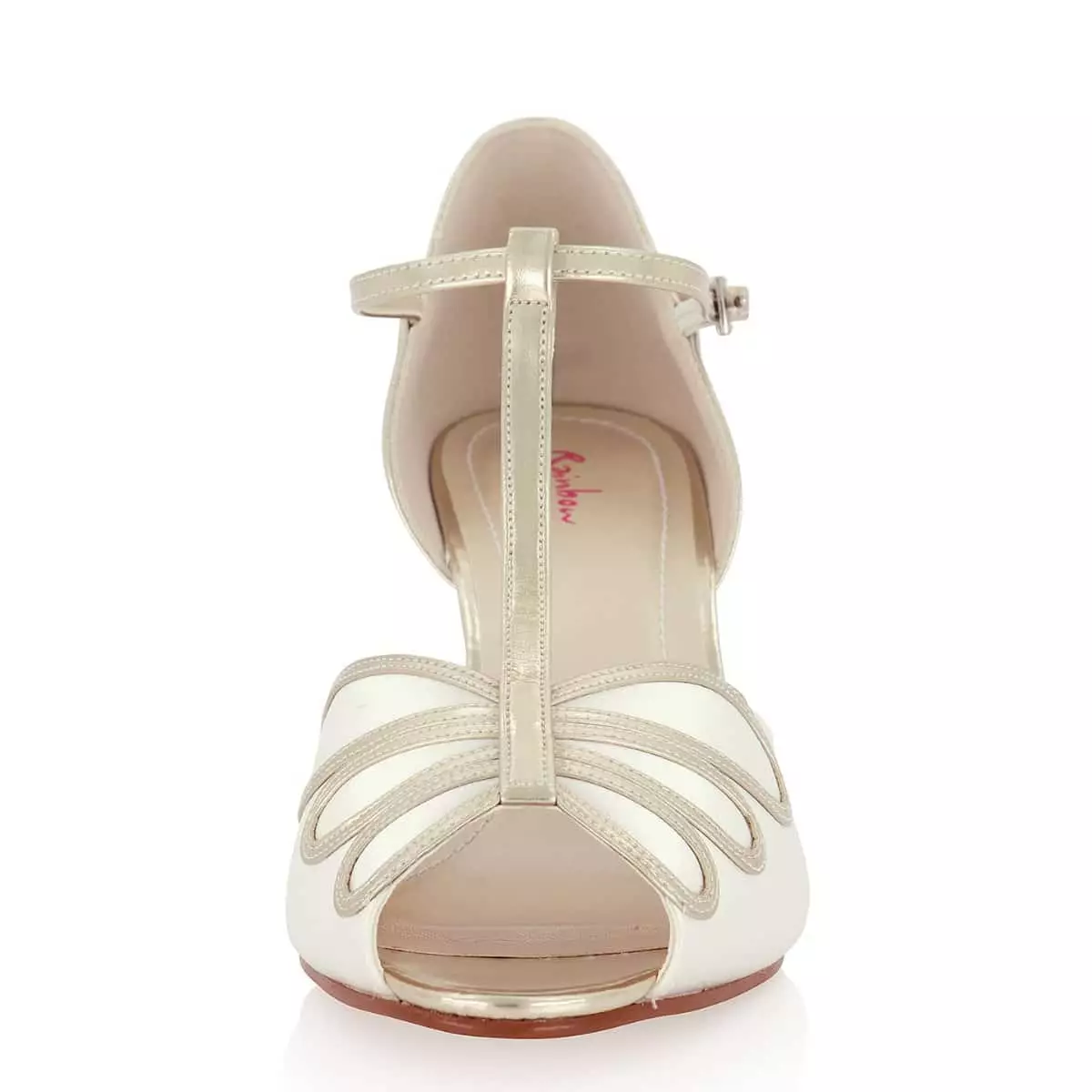 Elegante Brautschuhe Harlowe von Rainbow Club aus der Kollektion 2022. Diese Peeptoes haben ein ausgelassenes Design im Stil der Goldenen 20er. Dieses Design ist zurzeit besonders gefragt! Gefertigt sind die Schuhe aus hochwertigem Satin in Farbe Ivory mit stylischen goldenen T-Bar-Riemchen. Der 6,5 cm hohe Trichterabsatz ist besonders bequem und passt ideal zum klassischen Look dieses Modells. In Kombination mit einem weichen Soft Bliss-Futter in der Innensohle bieten sie einen hohen Tragekomfort.