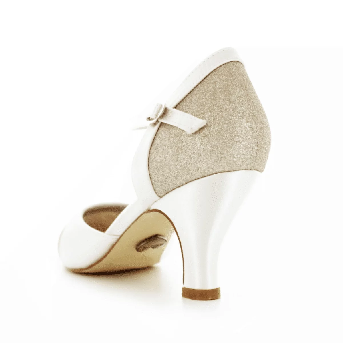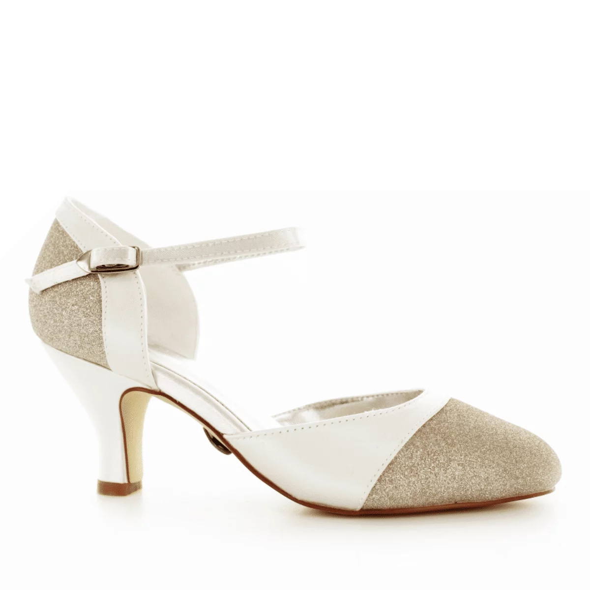 Die wunderschönen Brautschuhe 701 Ivory-Champagne aus der White Lady Kollektion . Die Schuhe sind aus Satin in Farbe Champagne gefertigt und mit Glitzern verziert. Dank dem 6,5 cm hohen Trichterabsatz, sind diese Brautschuhe besonders bequem beim Laufen und Stehen. Selbst Tanzen wäre keine große Herausforderung, da die Decksohle innen gepolstert ist. Das Modell 701 Ivory-Champagne passt für normal weite Füße. Diese Slingpumps sind bequem und sehen besonders elegant aus!