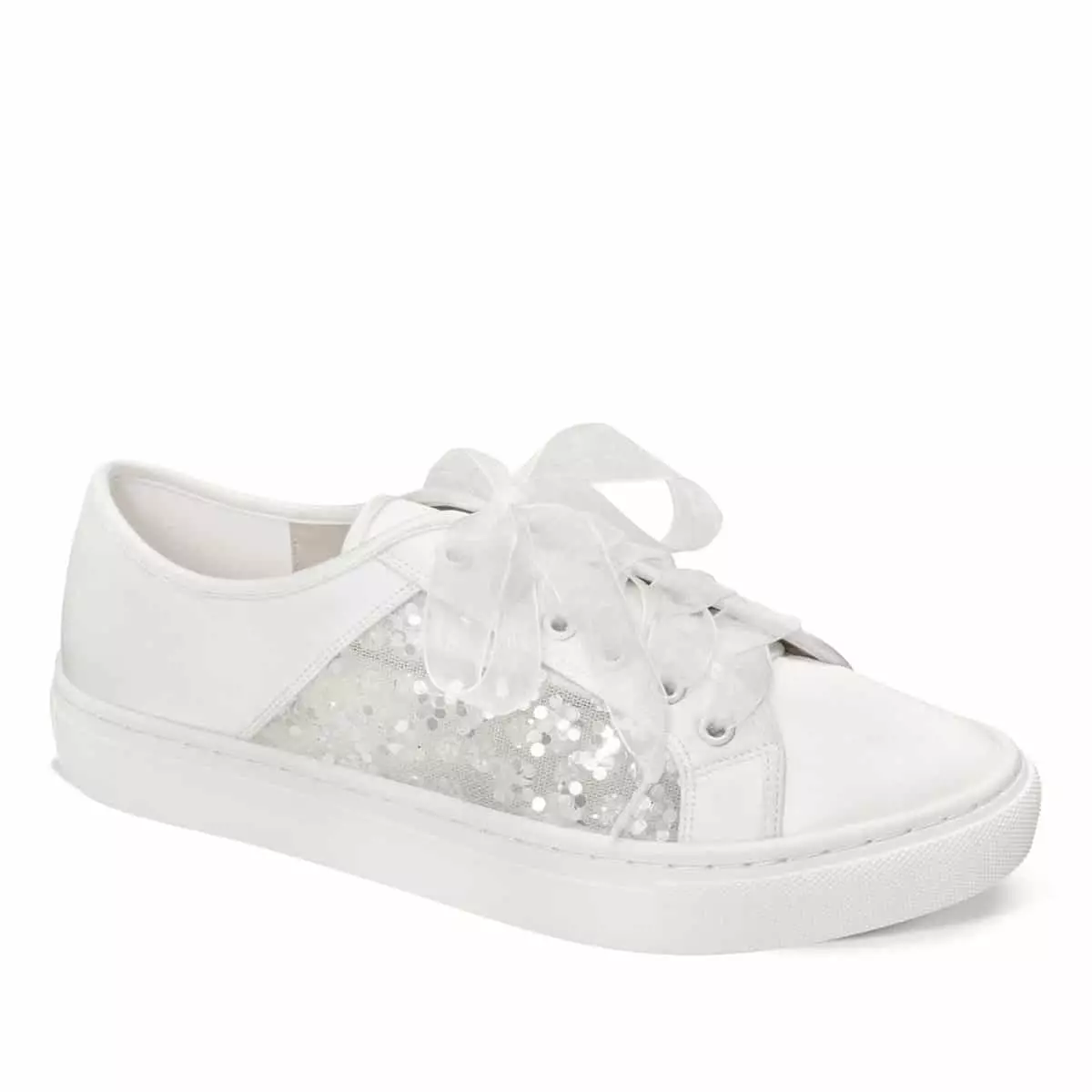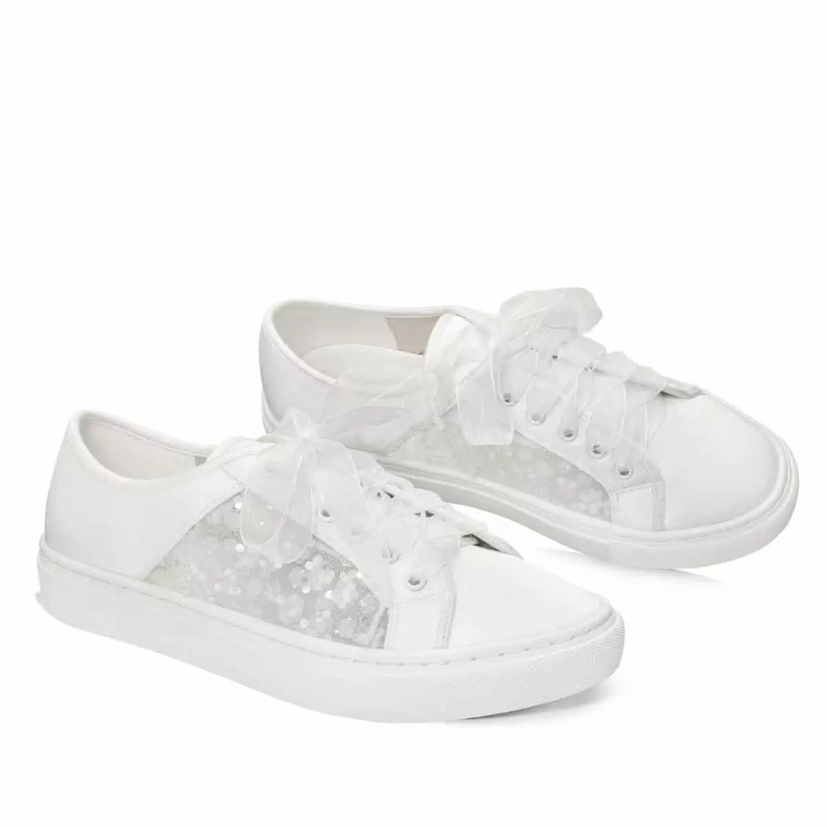 Elegante Brautsneaker Nelly aus der aktuellen Kollektion von G. Westerleigh. In Handarbeit gefertigt aus hochwertigem Satin und Spitze, die mit glitzernden Pailletten verziert ist. Die Sneaker Nelly sind eine perfekte Wahl für Hochzeitsfeiern im Freien. Die weiche Gel-Polsterung und die Lederinnensohle sorgen für eine wirklich bequeme Passform. Du erhältst als Geschenk zwei Paar Schnürsenkel. So kannst Du je nach Stil entweder die Organza- oder die Satin-Schnürsenkel wählen.