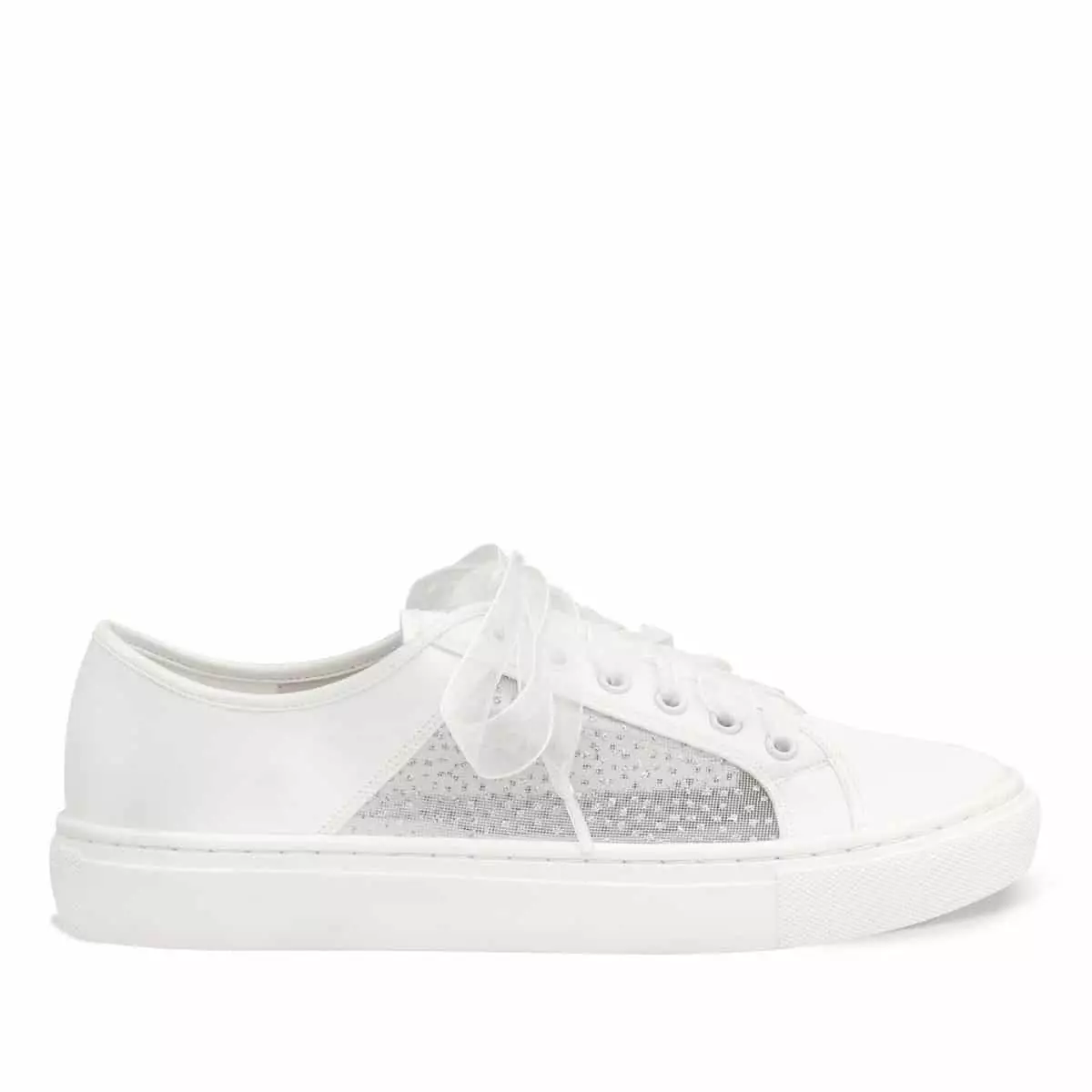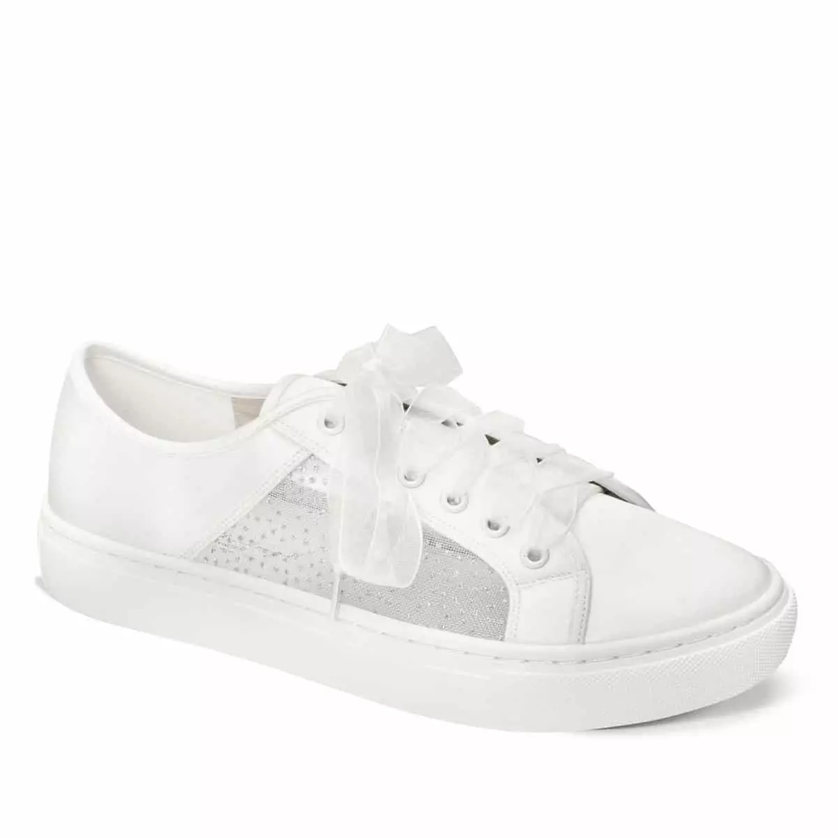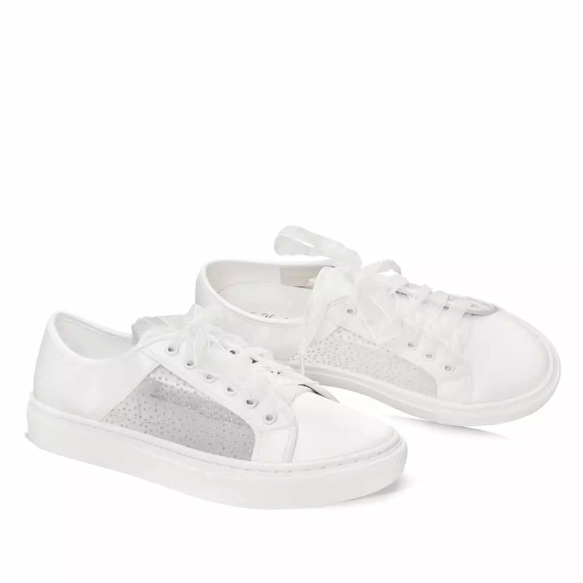 Hübsche Brautsneaker Nicole aus der aktuellen Kollektion von G. Westerleigh. In Handarbeit gefertigt aus hochwertigem Satin und transparentem Material, welcher mit hübschen silbernen Glitzerkristallen verziert ist, das diesen Sneakern einen modernen und trendigen Look verleiht. Die Sneaker Nicole sind eine perfekte Wahl für Sommerhochzeiten und Feiern im Freien. Die weiche Gel-Polsterung und die Lederinnensohle sorgen für eine wirklich bequeme Passform. Du erhältst als Geschenk zwei Paar Schnürsenkel. So kannst Du je nach Stil entweder die Organza- oder die Satin-Schnürsenkel wählen.